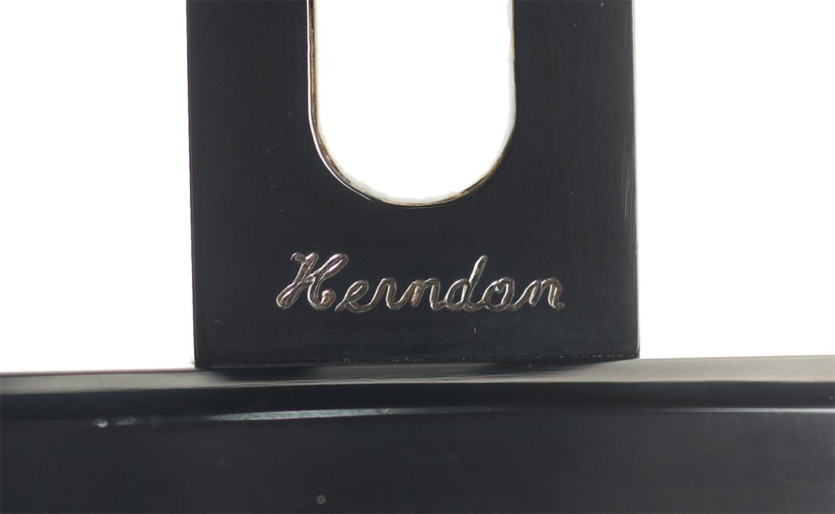 This dagger was handcrafted by Bill Herndon who has been a knifemaker for over 25 years and is the Vice President of the California Knifemakers Association. This Herndon dagger features a 11 1/2 inch long cruciform blade which has an extended ricasso. The ricasso has ivory panels and is signed by the master knifemaker, "Herndon". The steel components including the blade have a polished blue finish. The "T" shaped guard is handcrafted from steel and stag with the ends of the guard adorned with opaque stones. The handle is ivory and the pommel has a transparent stone inset. OAL: 17 1/4". The dagger is complete with a nicely figured wooden sheath.