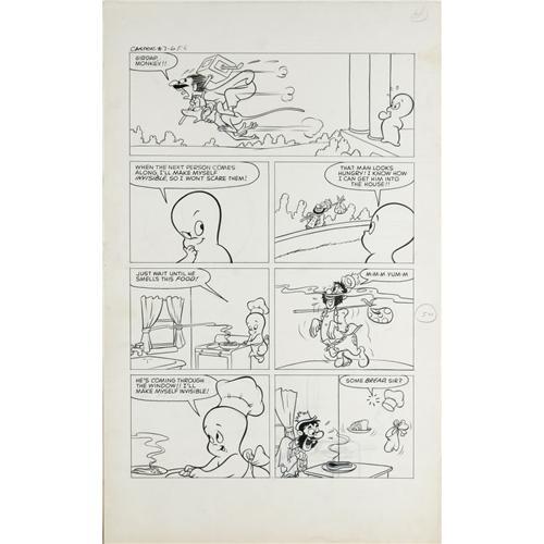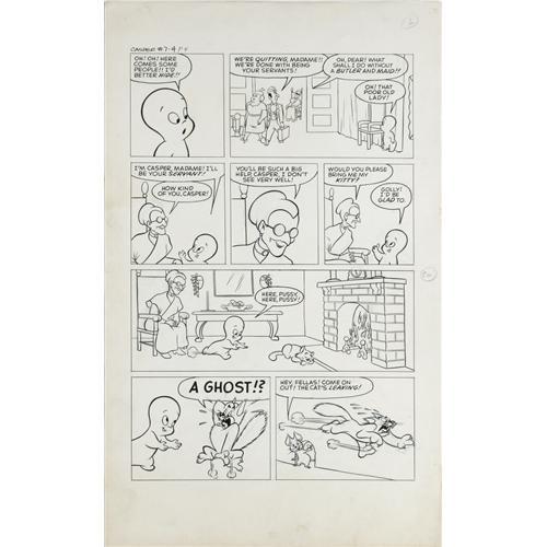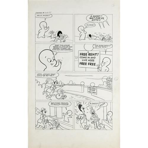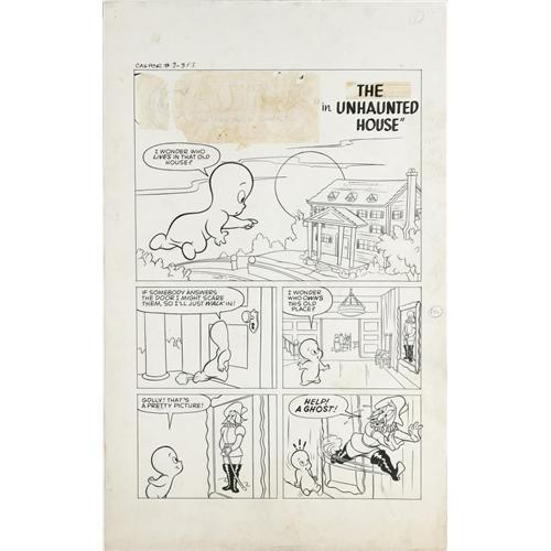 <B>Bill Hudson (attributed) - Casper the Friendly Ghost #7 Complete 7-page Story "The Unhaunted House" Original Art (Harvey, 1952).</B></I> This spook-ilicous chiller hails from Harvey's first published issue of <B>Casper, the Friendly Ghost</B></I>. Harvey took the title over from St. John starting with issue #7. You'll be haunted if you don't bid on this superb early Casper art. The image area of each page measures 12" x 18", and the art averages Very Good condition. <BR><BR><B>Important notice:</B> Heritage usually auctions material at the rate of 200-250 lots per hour. On some occasions eBay Live bid software or the Internet may not be able to keep up with the pace of the auction. We recommend placing a realistic absentee bid now as insurance to avoid disappointment. Occasionally the auctioneer may eliminate or reject an eBay Live bid, and the auctioneer may also reopen a lot after the close of the eBay live bidding (usually because we missed an audience bid), and may reject your bid even if it shows you as the winning bidder. By bidding via eBay Live, you agree that Heritage may award the lot to another bidder at its sole discretion under the circumstances described above or any other reasonable circumstances. Since eBay bids are not shown to us until we open the lot on the floor, we treat those bids just like floor bids. In most cases the floor responds before the eBay bid is presented to us, due to Internet lag time, so for consistency we have made it a policy that floor bids are always considered first over tie eBay live bids. Also please note that all Heritage lots purchased through eBay Live carry a 22.5% Buyer's Premium. Please make sure you read the Terms and Conditions before you bid. This lot is being auctioned in conjunction with a live floor auction by Heritage Auction Galleries. All final auction and invoice information will be supplied by Heritage Auction Galleries, and all other information should be considered preliminary. Lot:41001 <BR><BR><B>Winning Notification and Billing:</B> After the FINAL session in this auction is complete, Heritage will send e-mail and snail mail invoices. This process normally takes several days. All final auction and invoice information will be supplied by Heritage Auction Galleries, and all other information should be considered preliminary. <BR><BR>This auction will be conducted on a live auction floor and over the Internet through eBay Live. If you choose to place an absentee bid, please take a moment to <font color='#0000ff'><u><a href='http://pages.ebay.com/liveauctions/help/before/laabsentee.html'>learn how eBay Live absentee bidding works</a></u></font><font color='#000000'>