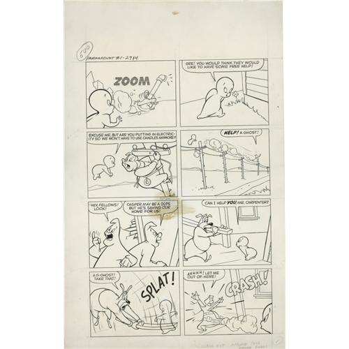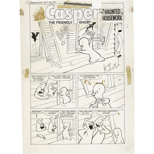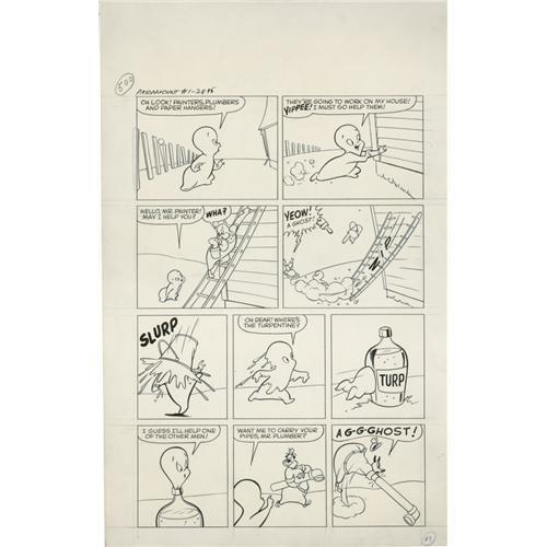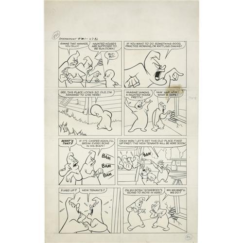 <B>Bill Hudson (attributed) - Harvey Hits #60 (Paramount Animated Comics #1), Complete 5-page Casper Story "Haunted House" Original Art (Harvey, 1953).</B></I> This early Casper appearance was but his second appearance as a Harvey feature. Casper's attempts at home improvement for the haunted house are frowned upon by the other ghosts, but by story's end, Casper redeems himself when he scares away home-hunters. The image area of each page measures 12" x 18". Page one was cut between panel tiers one and two, and there are a few tape and glue stains on the pages; otherwise, the art is in Excellent condition.