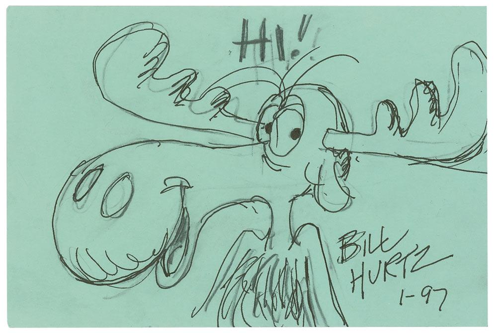 Original signed pencil and ink sketch of Bullwinkle on a green 6 x 4 card, signed in ink “Bill Hurtz 1-97” and adding “HI!” in pencil. In fine condition.
