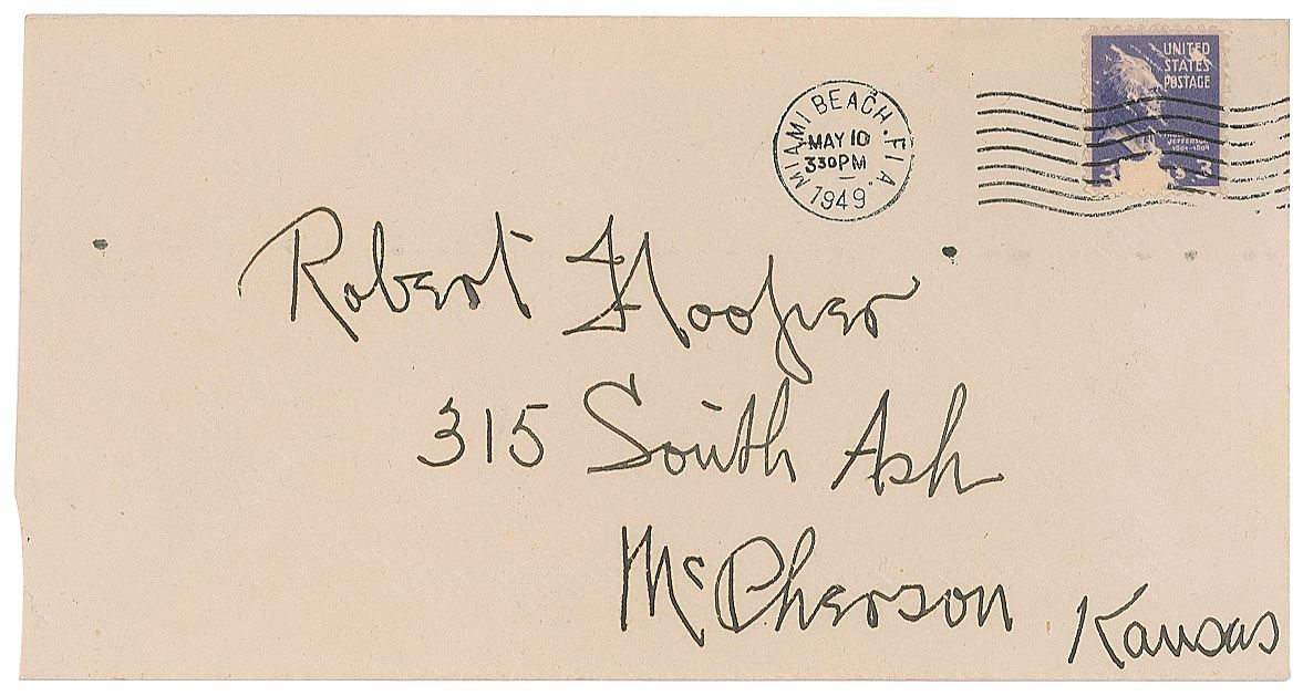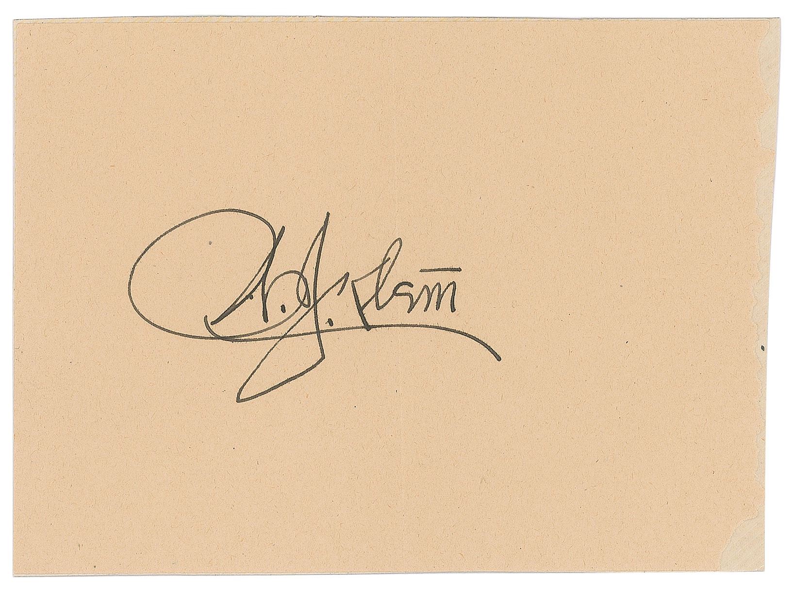 Vintage fountain pen signature, "W. J. Klem,” on an off-white 6 x 4.5 sheet affixed to a same-size cardstock mount. In fine condition, with a central vertical fold. Accompanied by the original mailing envelope, addressed in Klem's own hand, postmarked at Miami Beach, Florida, on May 10, 1949.