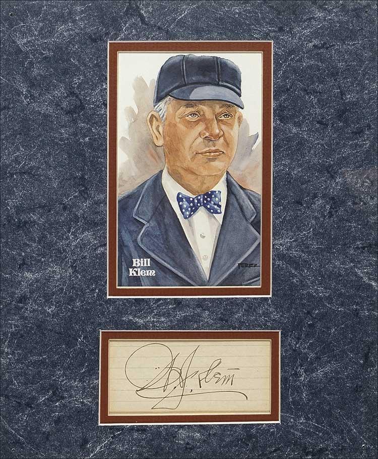 Hall of Fame umpire, famous for drawing the “dead line” in the dirt, which was up to the players to cross or not. Vintage ink signature, “W. J. Klem,” on an off-white lightly-lined card. Double matted with a Perez-Steele card, to an overall size of 9 x 10.5. In fine condition, with a light overall shade of toning and a couple of light creases. Pre-certified Steve Grad/PSA/DNA and RRAuction COA.
