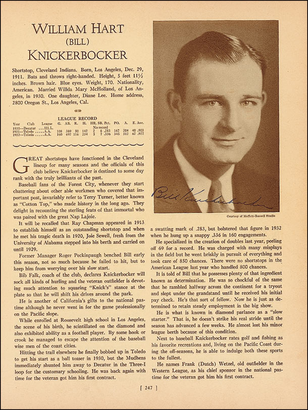 Major League Baseball shortstop (1911–1963). Who’s Who in Baseball book page, 8.5 x 11, featuring an image of Knickerbocker and his stats, signed on his image in fountain pen, “Bill Knickerbocker.” In fine condition with a few small creases.
