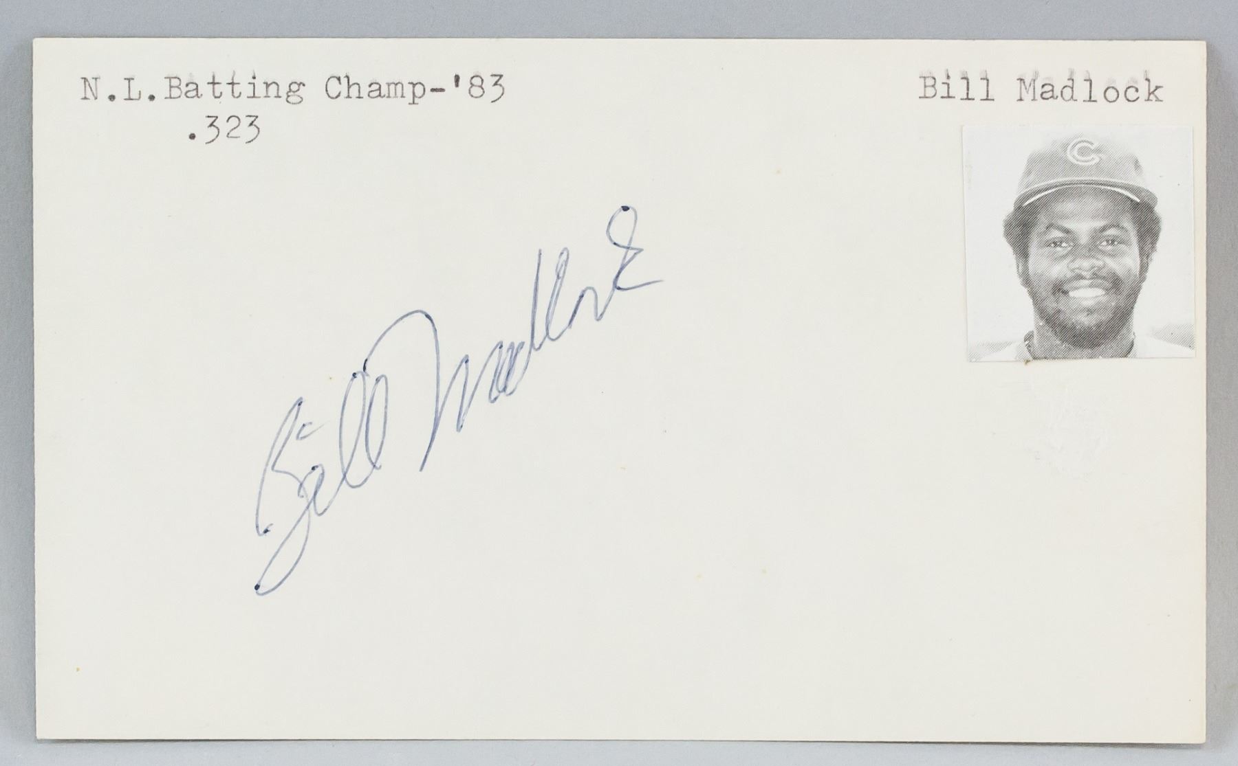 Autographed cut card. Signed Bill Madlock (1951- , American) with image on the top right corner. Inscribed N.L. Batting Champ-'83 / .323 on the top left corner. Sticker Inscribed "GAi Global Certified Authentic GV 61714" on verso. Accompanied a GAi Certificate of Authenticity. 7.6 x 12.7 cm (3 x 5 in). Photograph not included. Provenance: Private American collection, Massachusetts. Bill "Mad Dog" Madlock, Jr. is an American former professional baseball player and coach. He played in Major League Baseball as a third baseman from 1973 to 1987. Madlock is notable for being a four-time National League batting champion.