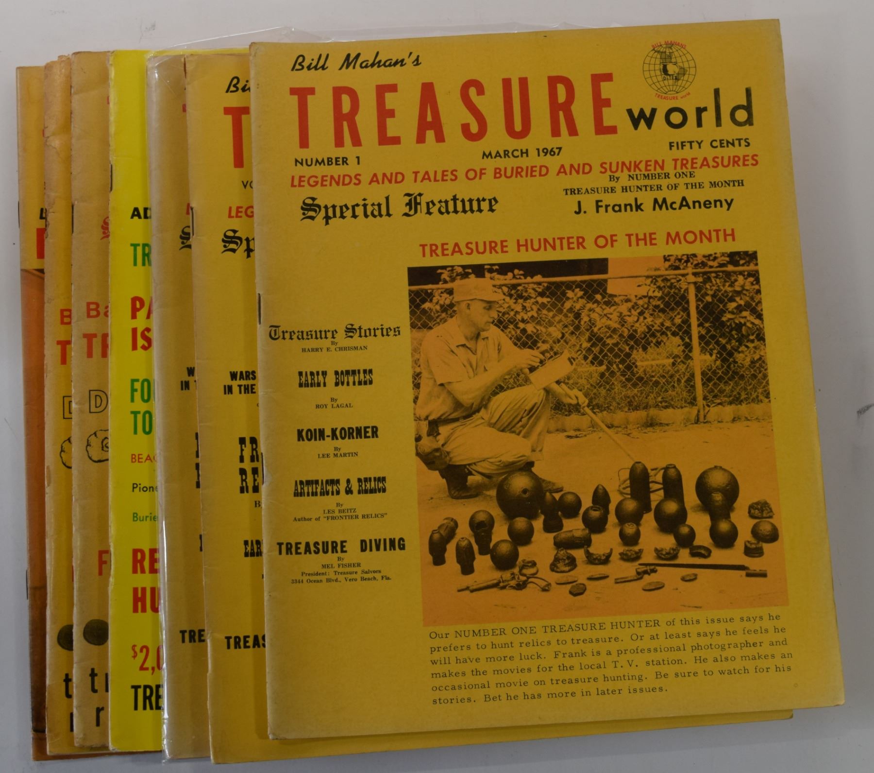 This lot contains issues of the very rare treasure hunting magazine: Bill Mahan's Treasure World for the year(s) 1967-1968. Treasure World was started by publisher Bill Mahan as possibly a quarterly publication in the spring of 1967. It continued until possibly the end of 1968 or the beginning of 1969. The last stated issue didn't have any publish date associated with it. It was turned over to Long John Latham and he resumed publication with the July issue of 1969. Issues included in this lot: