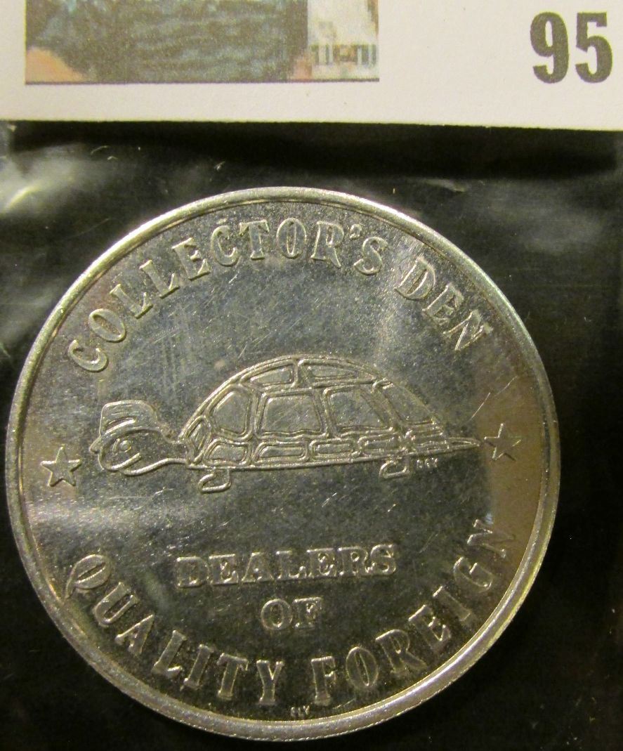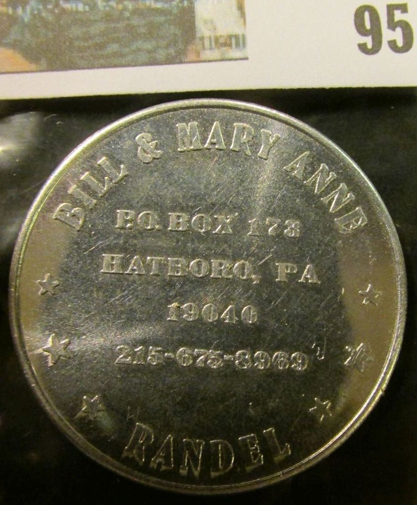 "Bill & Mary Anne/P.O. Box 173/Hatboro, Pa./19040/215-675-5969/R& el", "Collector's Den/Dealers/of/Quality Foreign", al., 39mm, BU.