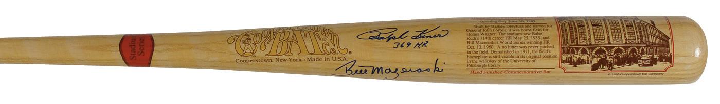 Official Cooperstown Bat Company Forbes Field Stadium Series commemorative baseball bat signed in blue felt tip on the barrel, “Bill Mazeroski” and “Ralph Kiner 369 HR.” In very fine condition.