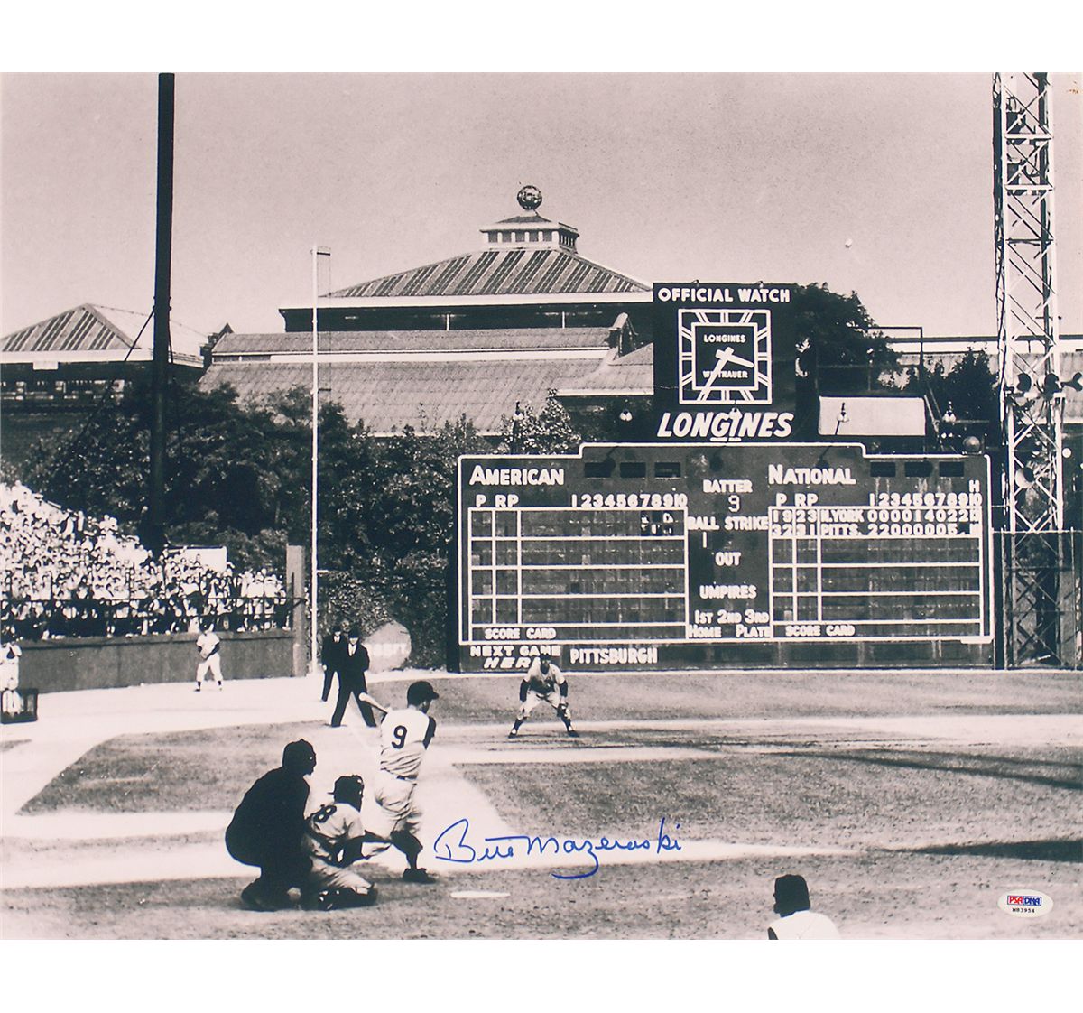 Satin-finish 20 x 16 photo of Mazeroski’s historic World Series winning home run in 1960, signed in blue felt tip. In very good condition, with a tear to the bottom border and a PSA/DNA label affixed to the lower right corner.