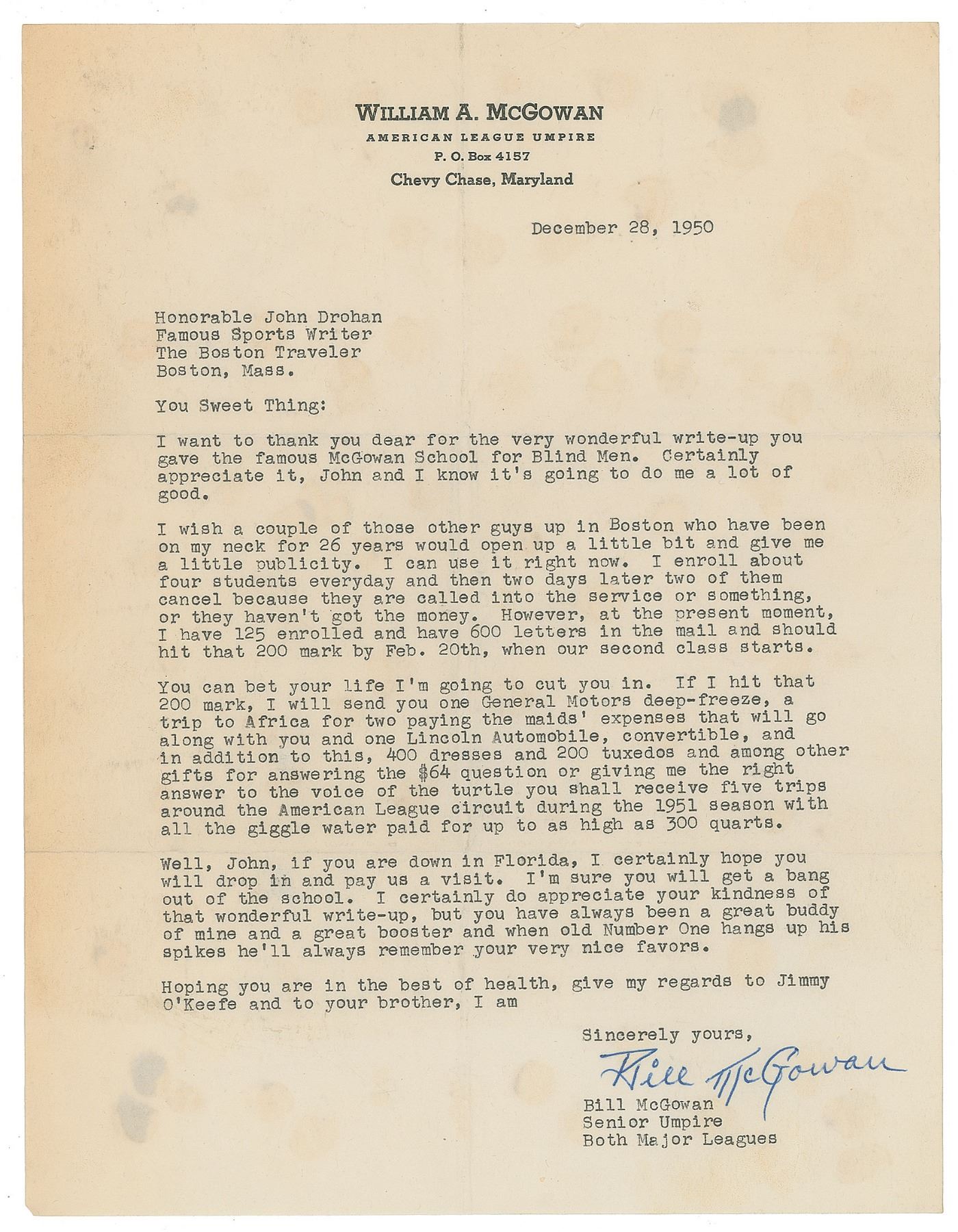 Typed letter signed "Bill McGowan," one page, 8.5 x 11, personal letterhead, December 28, 1950. Letter to John Drohan, a reporter and baseball writer for the Boston Traveler, in part: "I want to thank you dear for the very wonderful write-up you gave the famous McGowan School for Blind Men. Certainly appreciate it, John and I know it's going to do me a lot of good. I wish a couple of those other guys up in Boston who have been on my neck for 26 years would open up a little bit and give me a little publicity. I can use it right now. I enroll about four students everyday and then two days later two of them cancel because they are called into the service or something, or they haven't got the money. However, at the present moment, I have 125 enrolled and have 600 letters in the mail and should hit that 200 mark by Feb. 20th, when our second class starts." In fine condition, with intersecting folds.