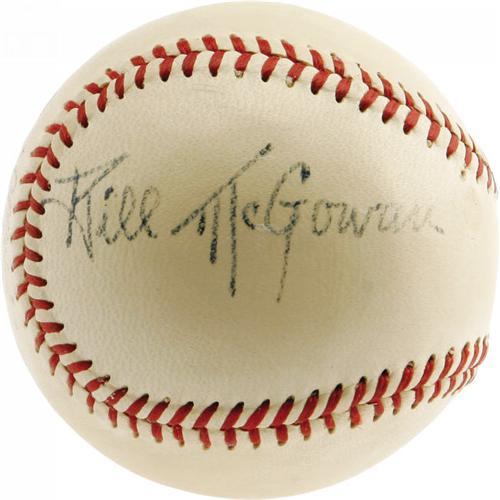 <B>1940's Bill McGowan "Single Signed" Baseball.</B></I> Those legions of collectors chasing Hall of Fame singles almost certainly find a hole in their collections where this umpire should reside. McGowan's posthumous induction almost four decades after his passing, and the very fact that he was an umpire rather than a player, are factors that have kept the supply of his autographs particularly low. And the few signed baseballs that do exist are typically those signed by entire umpiring staffs. We believe that this ball was once of that ilk, but chemical wizardry at the hands of "Signed Baseball Magic" has turned this ONL (Frick) ball from a multi-signed sphere into an apparent single. Only you will know the difference! Even better, McGowan's signature is a large and bold 8.5/10 in quality. Ask yourself--when was the last time you saw a genuine McGowan single? We can't think of one either... <I>LOA from PSA/DNA.</B></I> <BR><BR><B>Important notice:</B> Heritage usually auctions material at the rate of 200-250 lots per hour. On some occasions eBay Live bid software or the Internet may not be able to keep up with the pace of the auction. We recommend placing a realistic absentee bid now as insurance to avoid disappointment. Occasionally the auctioneer may eliminate or reject an eBay Live bid, and the auctioneer may also reopen a lot after the close of the eBay live bidding (usually because we missed an audience bid), and may reject your bid even if it shows you as the winning bidder. By bidding via eBay Live, you agree that Heritage may award the lot to another bidder at its sole discretion under the circumstances described above or any other reasonable circumstances. Since eBay bids are not shown to us until we open the lot on the floor, we treat those bids just like floor bids. In most cases the floor responds before the eBay bid is presented to us, due to Internet lag time, so for consistency we have made it a policy that floor bids are always considered first over tie eBay live bids. Also please note that all Heritage lots purchased through eBay Live carry a 22.5% Buyer's Premium. Please make sure you read the Terms and Conditions before you bid. This lot is being auctioned in conjunction with a live floor auction by Heritage Galleries & Auctioneers. All final auction and invoice information will be supplied by Heritage Galleries & Auctioneers, and all other information should be considered preliminary. Lot:19014 <BR><BR><B>Winning Notification and Billing:</B> After the FINAL session in this auction is complete, Heritage will send e-mail and snail mail invoices. This process normally takes several days. All final auction and invoice information will be supplied by Heritage Galleries & Auctioneers, and all other information should be considered preliminary. <BR><BR>This auction will be conducted on a live auction floor and over the Internet through eBay Live. If you choose to place an absentee bid, please take a moment to <font color='#0000ff'><u><a href='http://pages.ebay.com/liveauctions/help/before/laabsentee.html'>learn how eBay Live absentee bidding works</a></u></font><font color='#000000'>