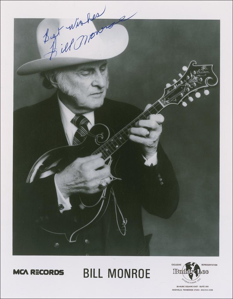 American musician (1911–1996) often referred to as the ‘Father of Bluegrass.’ Glossy 8 x 10 MCA Records publicity photo, signed in blue ink. In fine condition, with light surface impressions from collector’s notations on reverse, and a small clipped return address affixed to reverse.