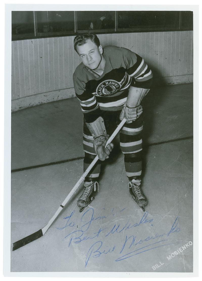 Hockey Hall of Famer (1921-1994) noted for recording the fastest hat trick in NHL history scoring three goals in 21 seconds. Glossy 5 x 7 photo of Mosienko on the ice for the Black Hawks, signed and inscribed in blue ballpoint “To Jim W. Best wishes, Bill Mosienko.” In fine condition, with some light skipping to signature and inscription.