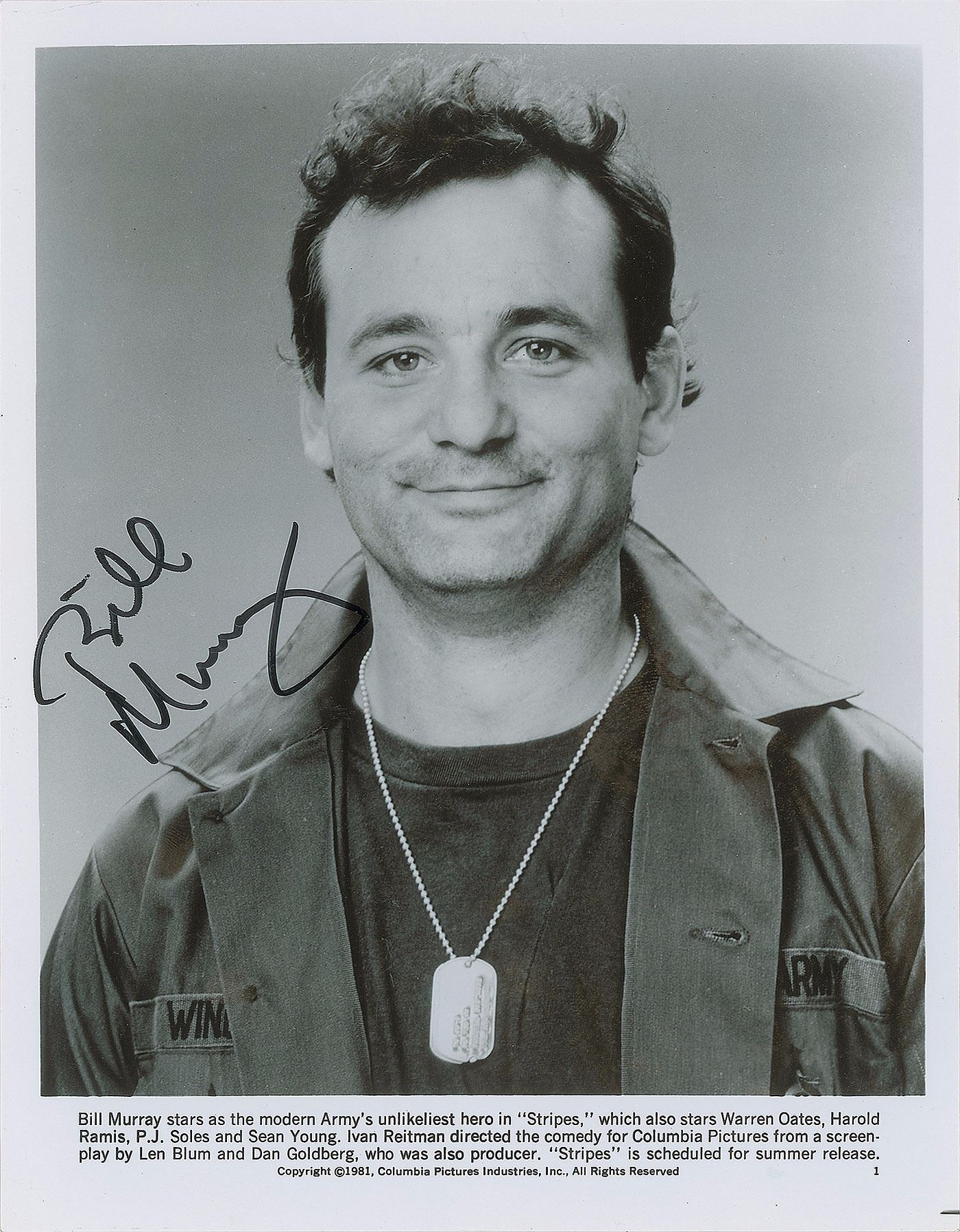 Glossy 8 x 10.25 Columbia Pictures publicity photo of Murray as Pvt. John Winger from the 1981 film Stripes, signed in black felt tip. In fine condition. From the Harvey and Rhoda Kuflik Collection.