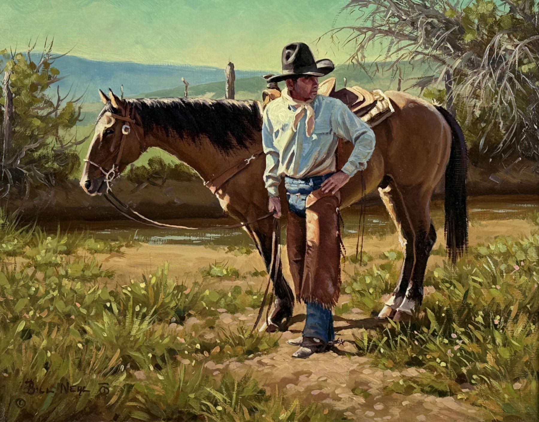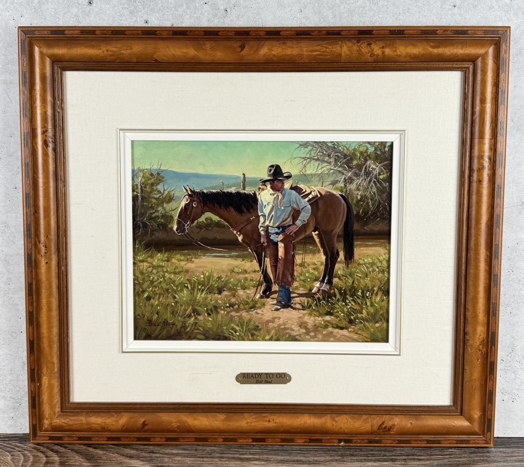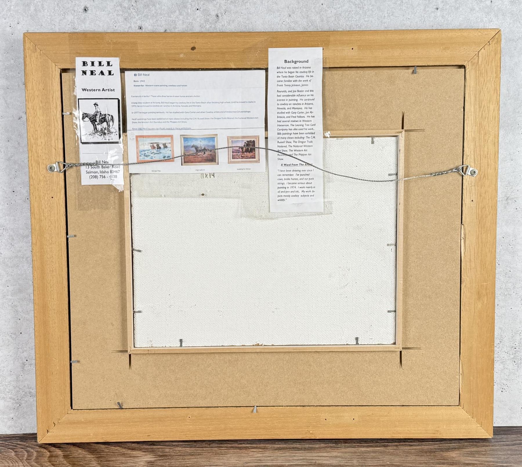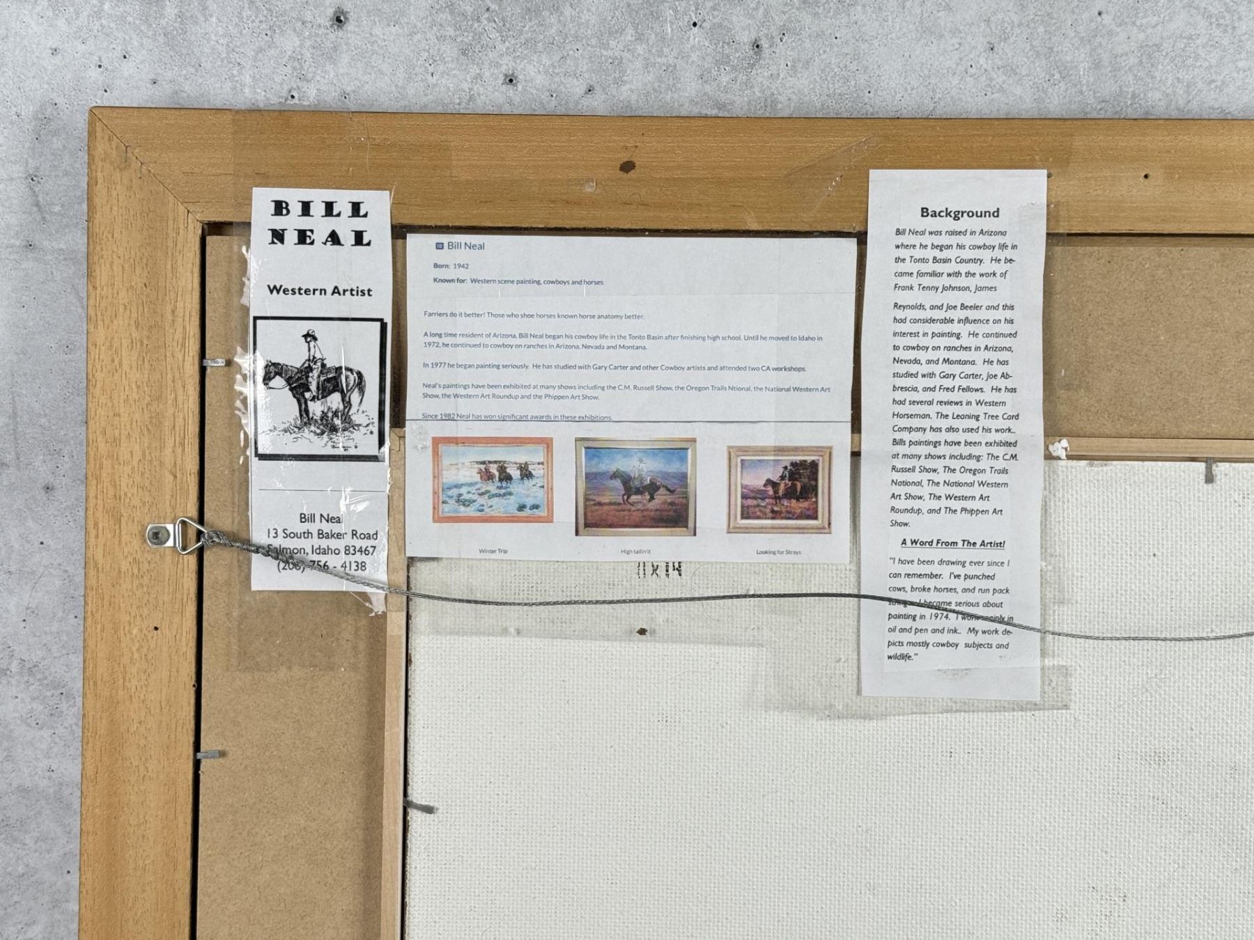 11" by 14". 21 1/2" by 24 1/2" framed. Oil on Board. Bill Neal (Born 1942) is active/lives in Arizona, Idaho. Bill Neal is known for Western scene painting, cowboys and horses. Farriers do it better! Those who shoe horses known horse anatomy better. A long time resident of Arizona, Bill Neal began his cowboy life in the Tonto Basin after finishing high school. Until he moved to Idaho in 1972, he continued to cowboy on ranches in Arizona, Nevada and Montana. In 1977 he began painting seriously. He has studied with Gary Carter and other Cowboy artists and attended two CA workshops. Neal's paintings have been exhibited at many shows including the C.M. Russell Show, the Oregon Trails Ntional, the National Western Art Show, the Western Art Roundup and the Phippen Art Show. Since 1982 Neal has won significant awards in these exhibitions. In 1988, more than 140 cowboy and western artists were asked to submit their work for a juried show at the Cowboy Artists of American Museum in Kerrville, Texas. Bill's oil, Headin Out was one of the twenty-two paintings selected to hang in the show. In 1989 Bill was asked to hang a piece of his work in the Buckaroo Hall of Fame in Winnemucca.
