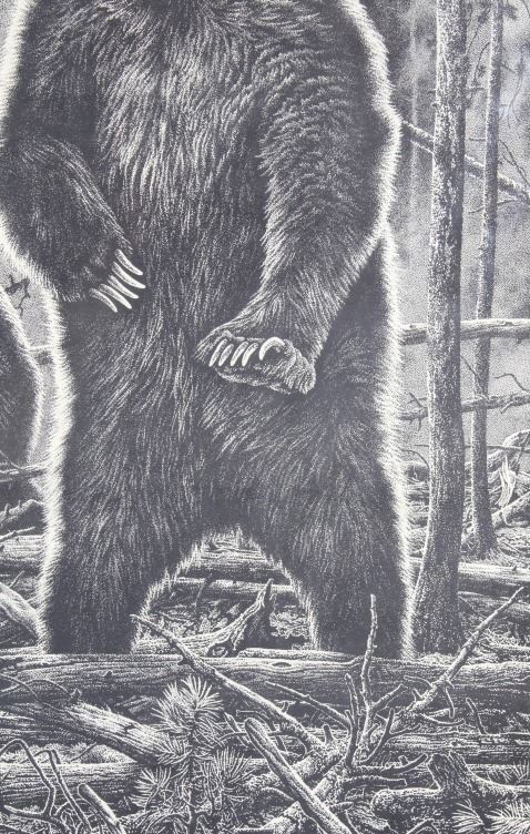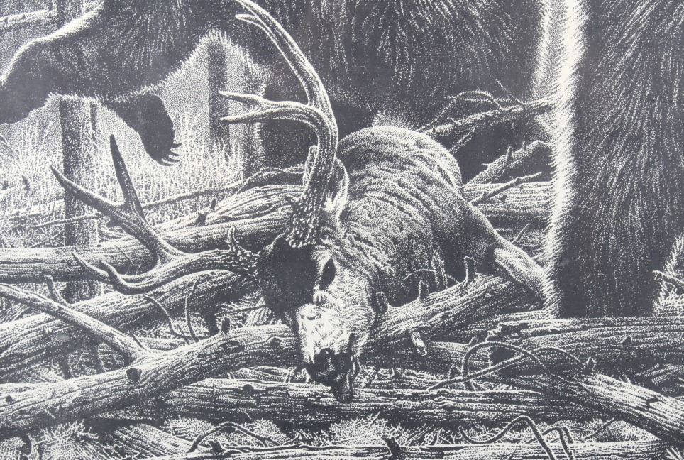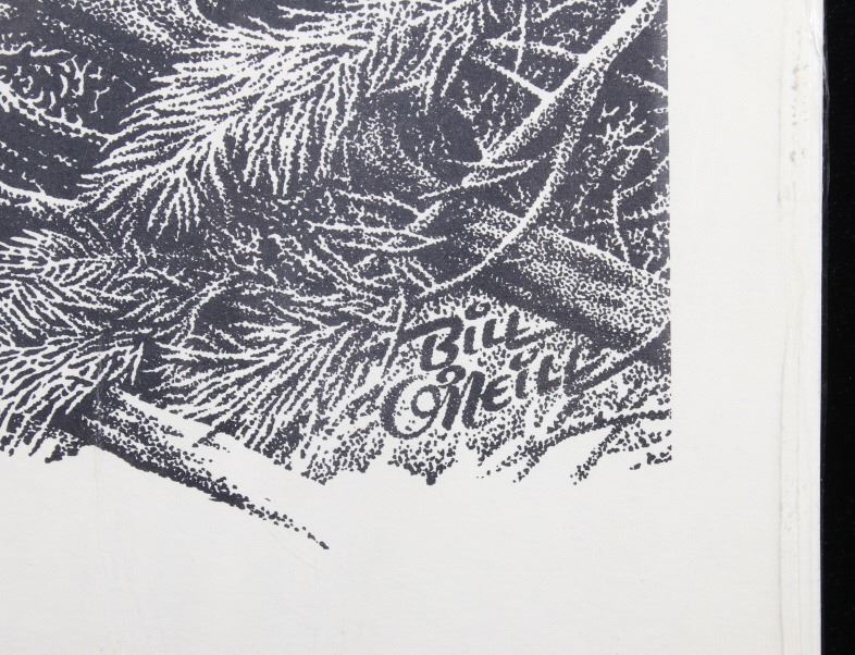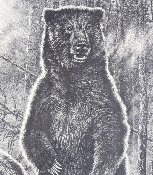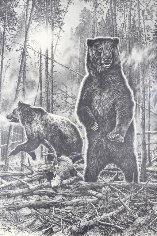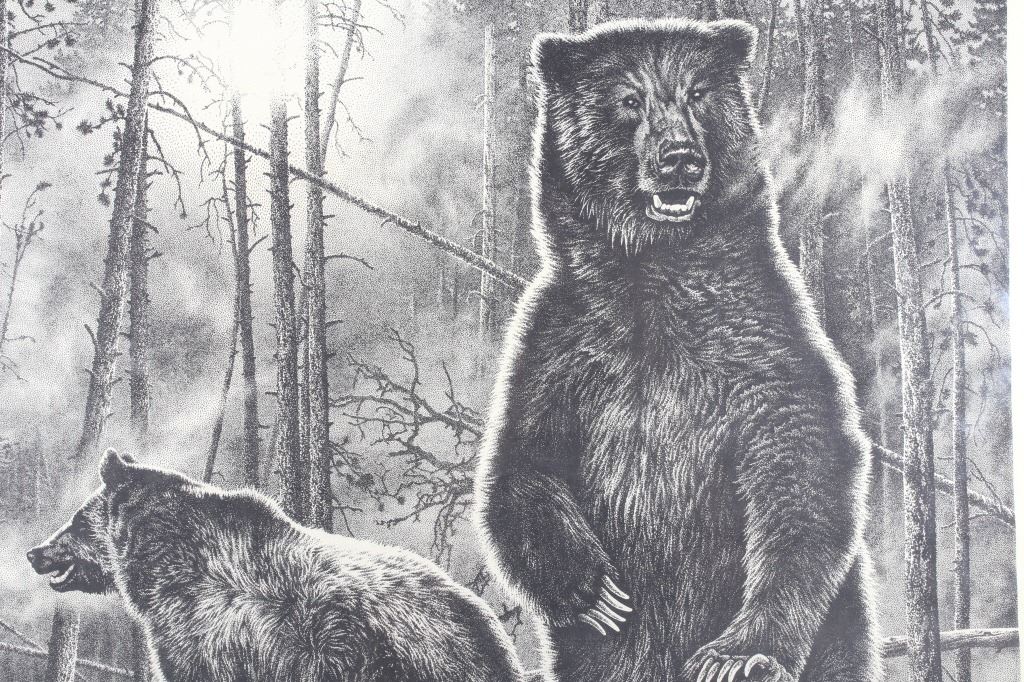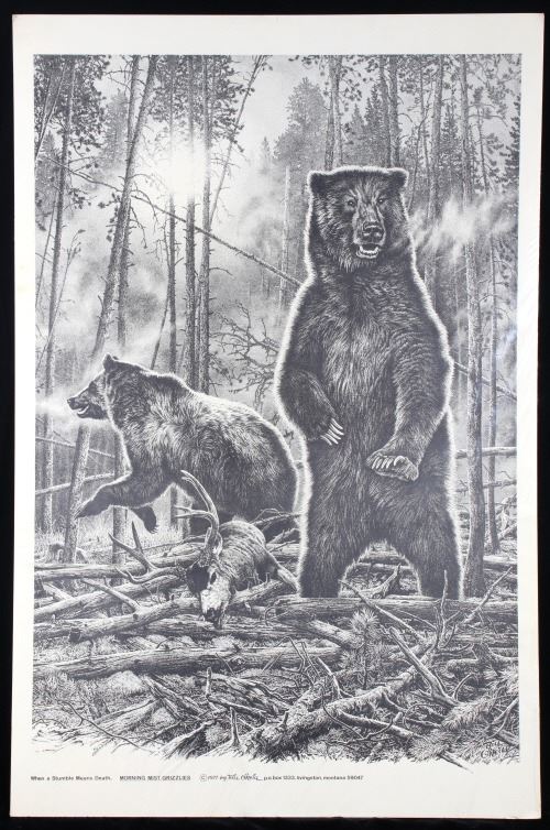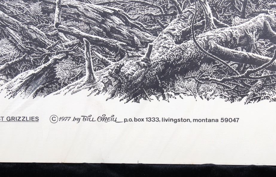 Offered in this lot we have a Bill O'Neill art print titled "Morning Mist Grizzlies" and originating from 1977. O'Neill is a Montana artist born in Livingston, Montana and is known for his black and white depictions of western wild life and figures. This piece depicts two adult grizzly bears, one standing with the other setting back down on to four paws and a dead mule deer on the logs between the bears. The bears are shown in a wooded area with fallen logs strewn across the ground and mist in the air. The print shows wonderful attention to detail and excellent realistic art style. The print is marked across the bottom reading "When a Stumble Means Death.. Morning Mist Grizzlies c1977 by Bill O'Neill p.o. box 1333, Livingston, Montana 59047". The print is still in its original protective clear plastic wrapping and shows good condition overall with some wear on the plastic. The piece measures 23" wide by 35" tall.