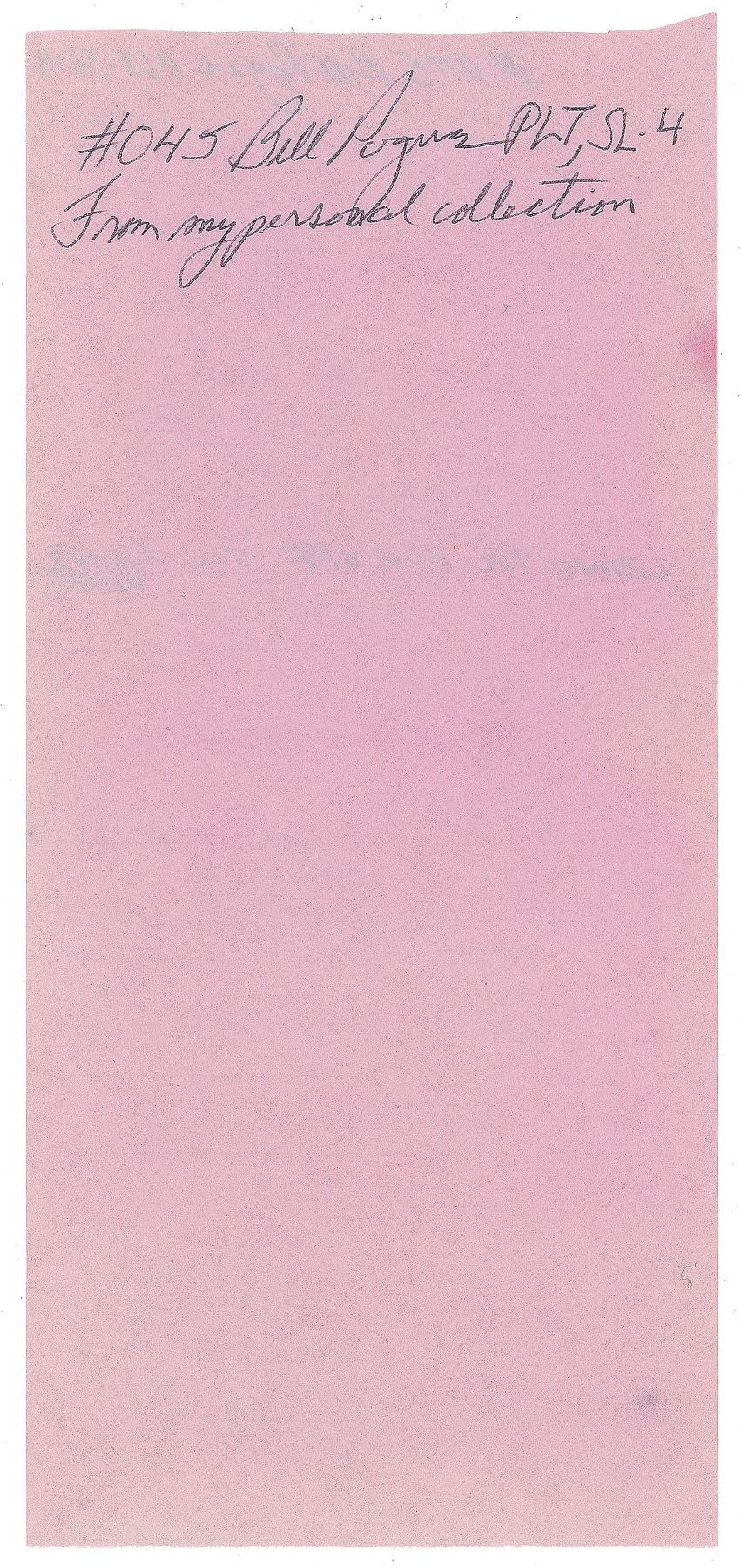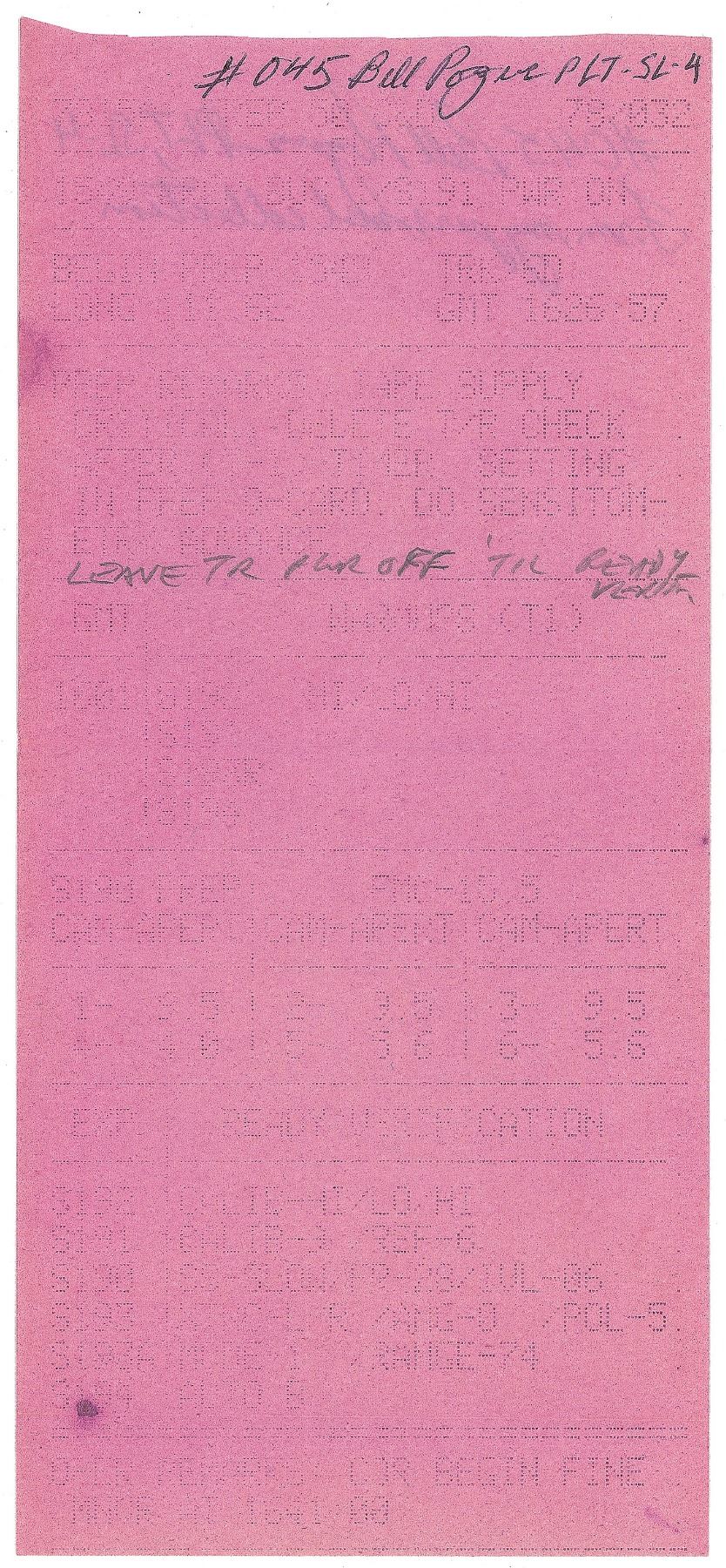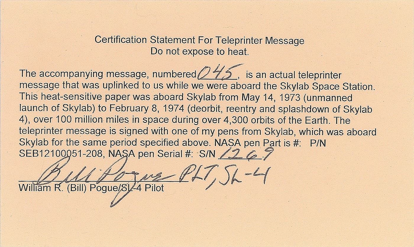 Flown uplinked teleprinter message, identified as number 45, on a pink 3.25 x 7 sheet of heat-sensitive paper which was flown aboard Skylab from May 14, 1973, to February 8, 1974, signed on the reverse in a flight-flown Skylab pen, "#045, Bill Pogue, PLT, SL-4, From my personal collection," and on the front, “#045 Bill Pogue PLT–SL–4.” Message bears printed commands and a pencil notation: "Leave TR PWR Off ‘Til Ready Verif." In fine condition. Accompanied by a certificate of authenticity signed by Pogue, stating: "The accompanying message, numbered 045, is an actual teleprinter message that was uplinked to us while we were aboard the Skylab Space Station…over 100 million miles in space during over 4,300 orbits of the Earth. The teleprinter message is signed with one of my pens from Skylab."
