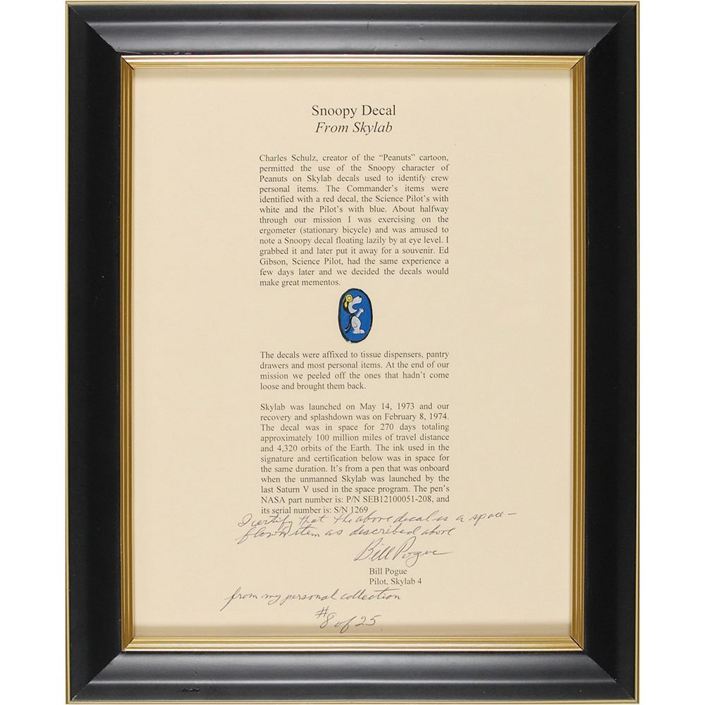 Bill Pogue's flown 'blue' Snoopy decal carried on the Skylab mission, measuring .75Ë x 1Ë and affixed to an 8 x 10.5 certificate of authenticity, which is signed in ink by Pogue with a pen that was also carried aboard the Skylab space station, "I certify that the above decal is a space-flown item as described above. Bill Pogue, from my personal collection #8 of 25." The certificate reads, in part: "The decal was in space for 270 days totaling approximately 100 million miles of travel distance and 4,320 orbits of the Earth. The ink used in the signature and certification below was in space for the same duration. It’s from a pen that was onboard when the unmanned Skylab was launched by the last Saturn V used in the space program.†Framed and in fine condition.