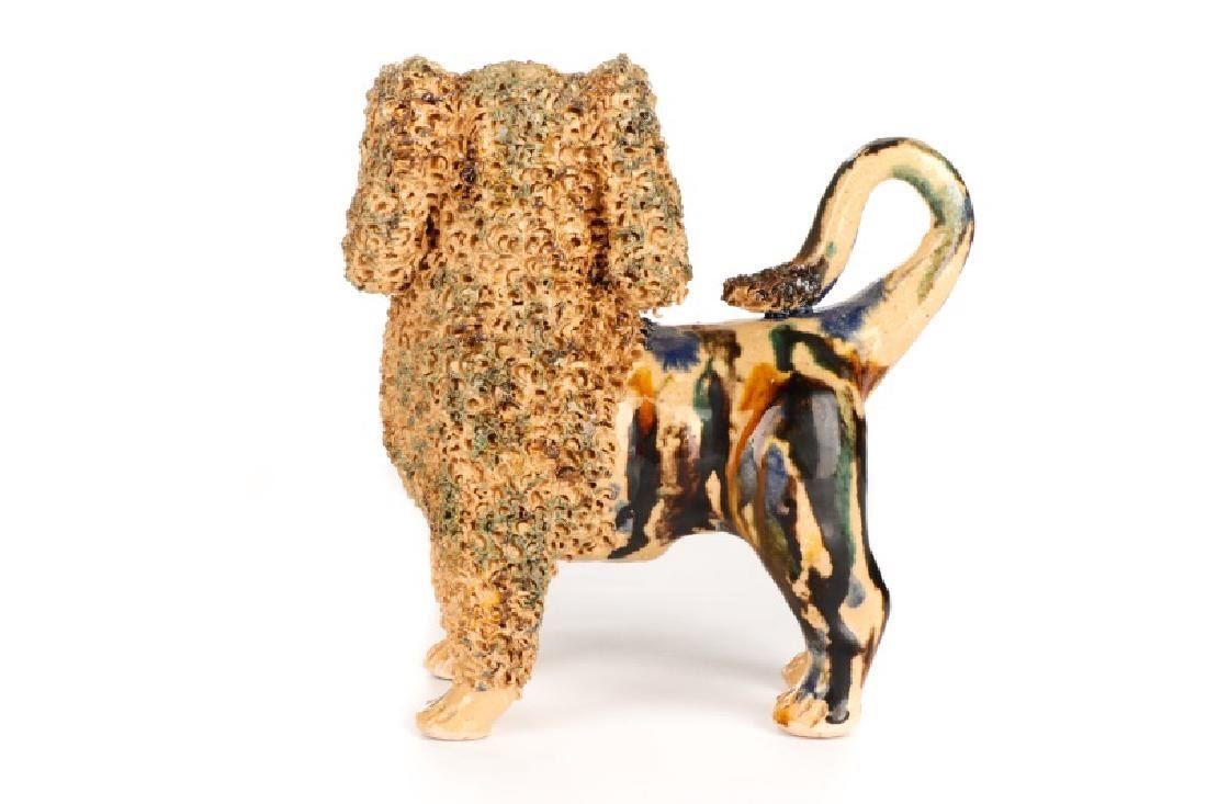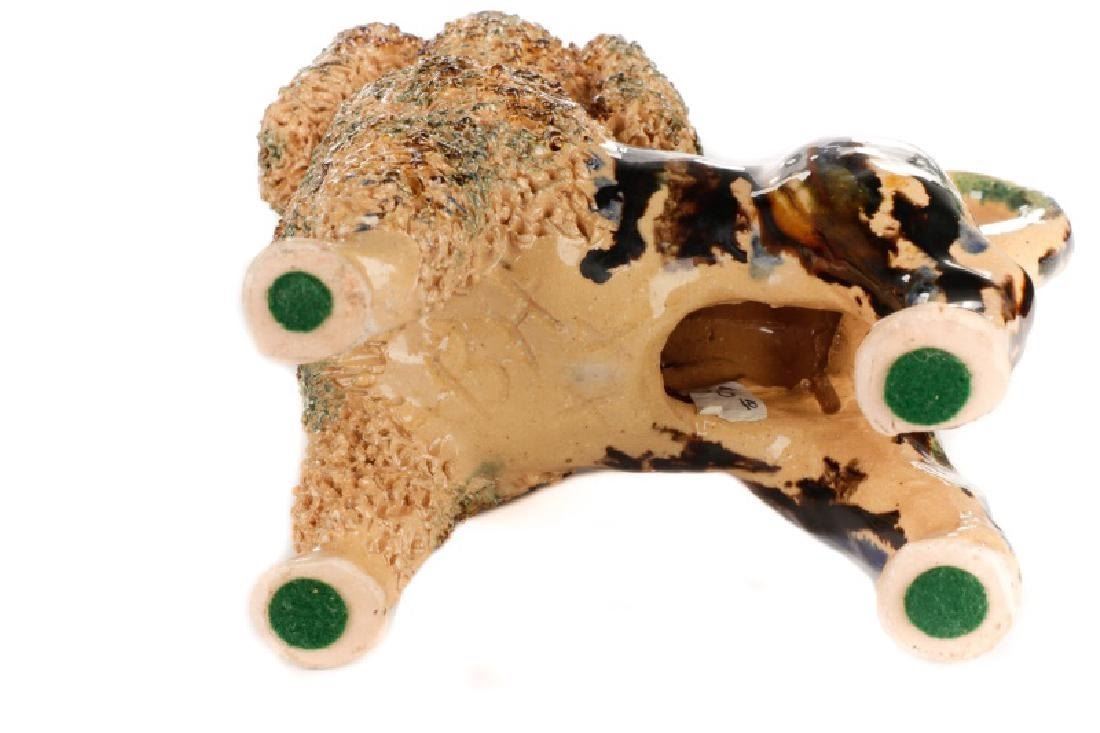 Billy Ray Hussey (American, Robbins, North Carolina, born 1955), circa 1980s. A molded and stoneware green, cobalt, and mustard lead glazed poodle with a basket. Signed to underside. Approximate height 7.25", width 6.25", depth 3.25"