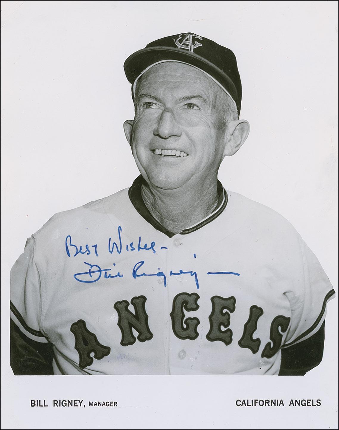 Baseball player (1918–2001) who played for the New York Giants and went on to manage three other teams from the 1950s to 1970s. Glossy 8 x 10 California Angels publicity photo of Rigney as the team’s manager, signed in blue felt tip. Scattered creases and bends, otherwise fine condition.