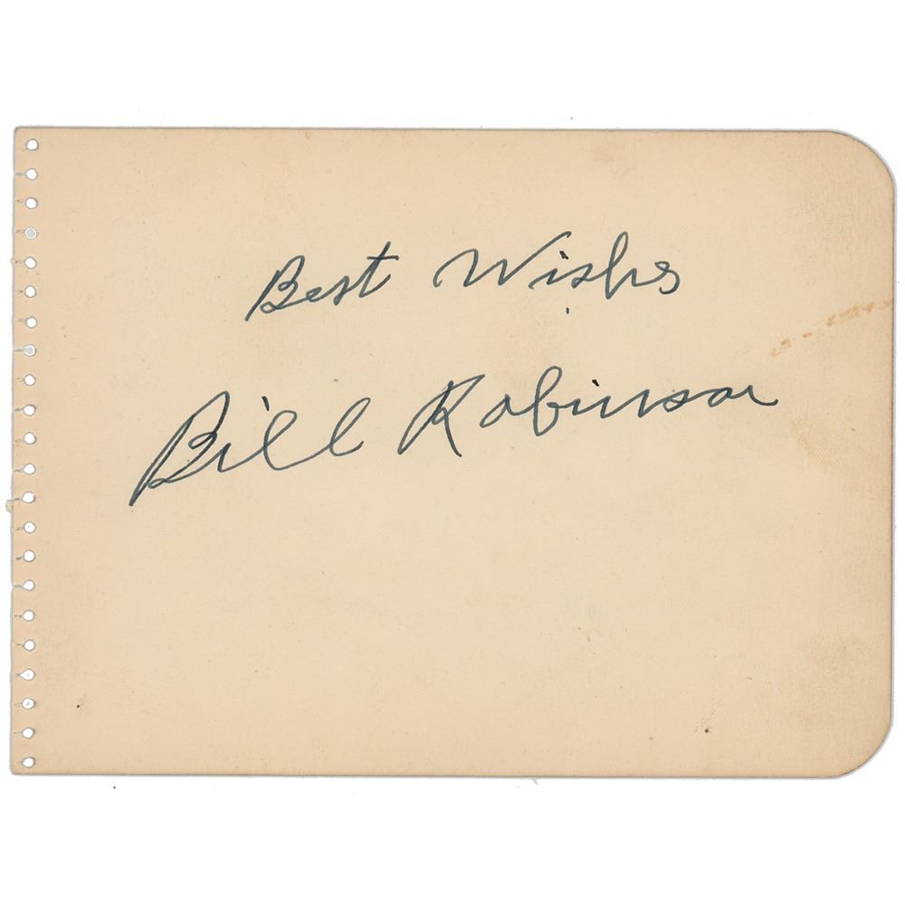 Vintage fountain pen signature of the popular tap dancer, "Best wishes, Bill Robinson,” on an off-white 5.75 x 4.25 album page. In fine condition.