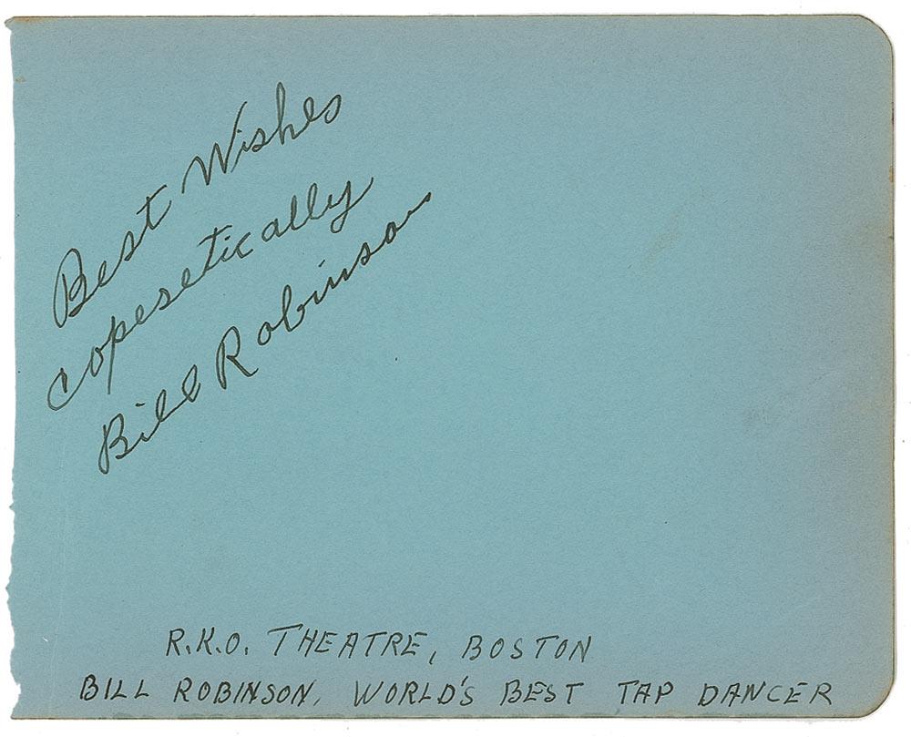 American entertainer (1878–1949), nicknamed “Bojangles,” who was one of the best-known dancer-actors of Hollywood’s Golden Age. Vintage fountain pen signature, “Best wishes, copesetically [sic], Bill Robinson,” on a light blue 5.5 x 4.5 album page, with collector’s notations to bottom of page. In fine condition, with a few wrinkles and some scattered light toning.