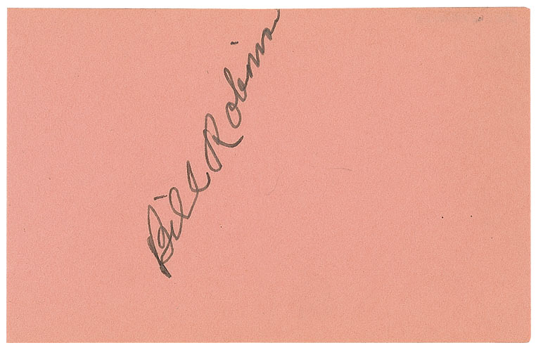 American entertainer (1878–1949), nicknamed “Bojangles,” who was one of the best-known dancer-actors of Hollywood’s Golden Age. Vintage fountain pen signature, “Bill Robinson,” on a light pink 4 x 2.5 album page. In fine condition.