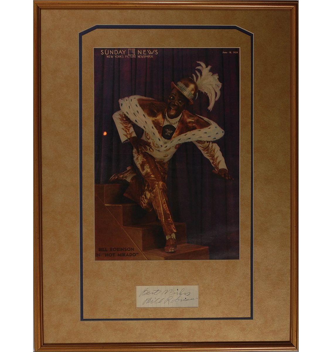 Vintage fountain pen signature, “Best wishes, Bill Robinson,” on an off-white 4.5 x 1.5 lined slip. Double matted and framed with a poster of Robinson in Hot Mikado to an overall size of 19 x 25. In fine condition. Oversized.