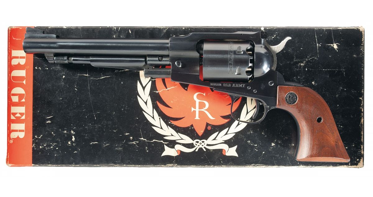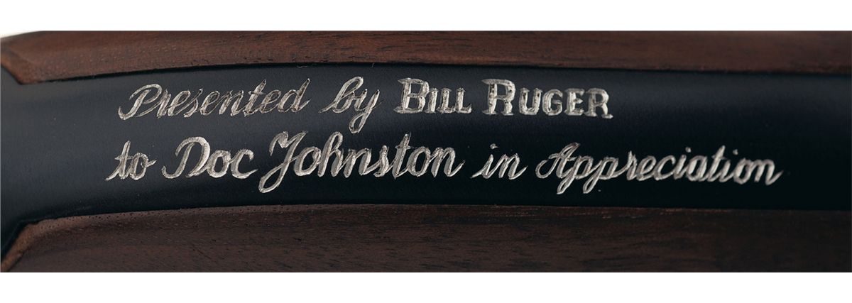 This is a standard Ruger Old Army that has been inscribed in script on the back strap "Presented by BILL RUGER/to Doc Johnston in Appreciation". The consignor's notes state "Doc Johnston, an early president of the OGCA (Ohio Gun Collectors Assoc), was a skilled maker of contemporary "Kentucky" long rifles. Doc had made a special one for Bill Ruger. And, this presentation "Old Model" was Bill Ruger's "Thank You" gift. With the original box numbered to gun and papers.