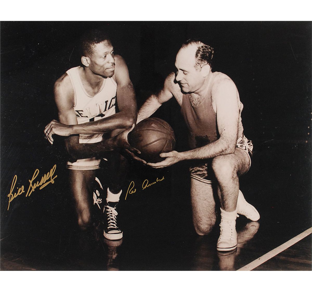 Satin-finish 20 x 16 photo of Russell and Auerbach taking a knee during Celtics practice, signed in gold ink by both. In fine condition.