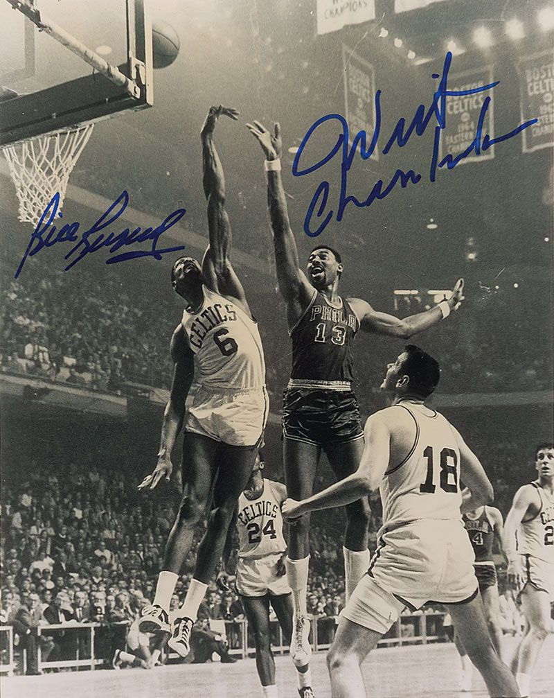 Glossy 8 x 10 photo of Russell and Chamberlain battling in the old Boston Garden, signed in blue felt tip by both. In fine condition.