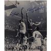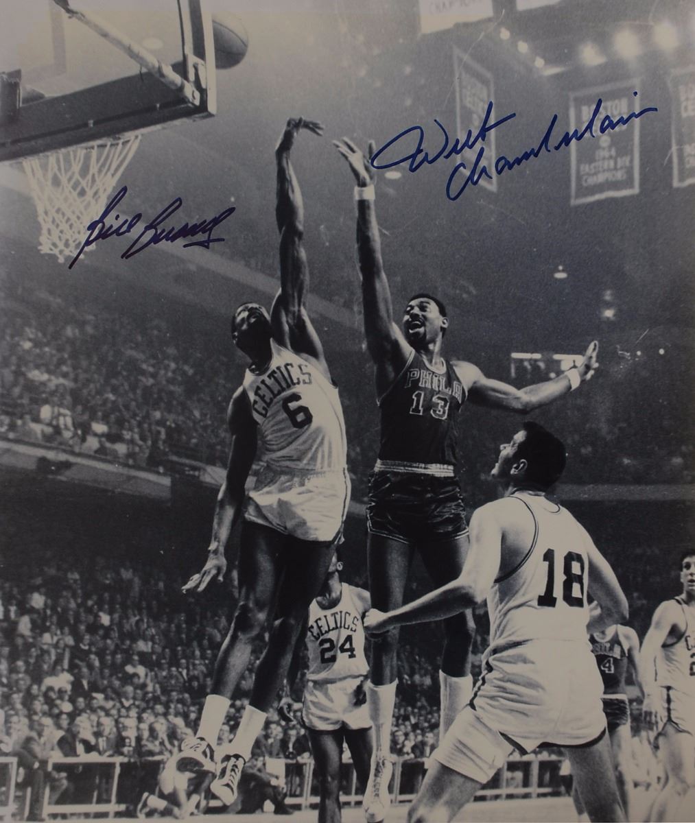 Excellent satin-finish 16 x 19 photo of Boston Celtics great Bill Russell attempting to block the shot of Philadelphia 76ers legend Wilt Chamberlain, signed in blue felt tip by both centers. In fine condition, with light overall toning from prior display. Pre-certified PSA/DNA.