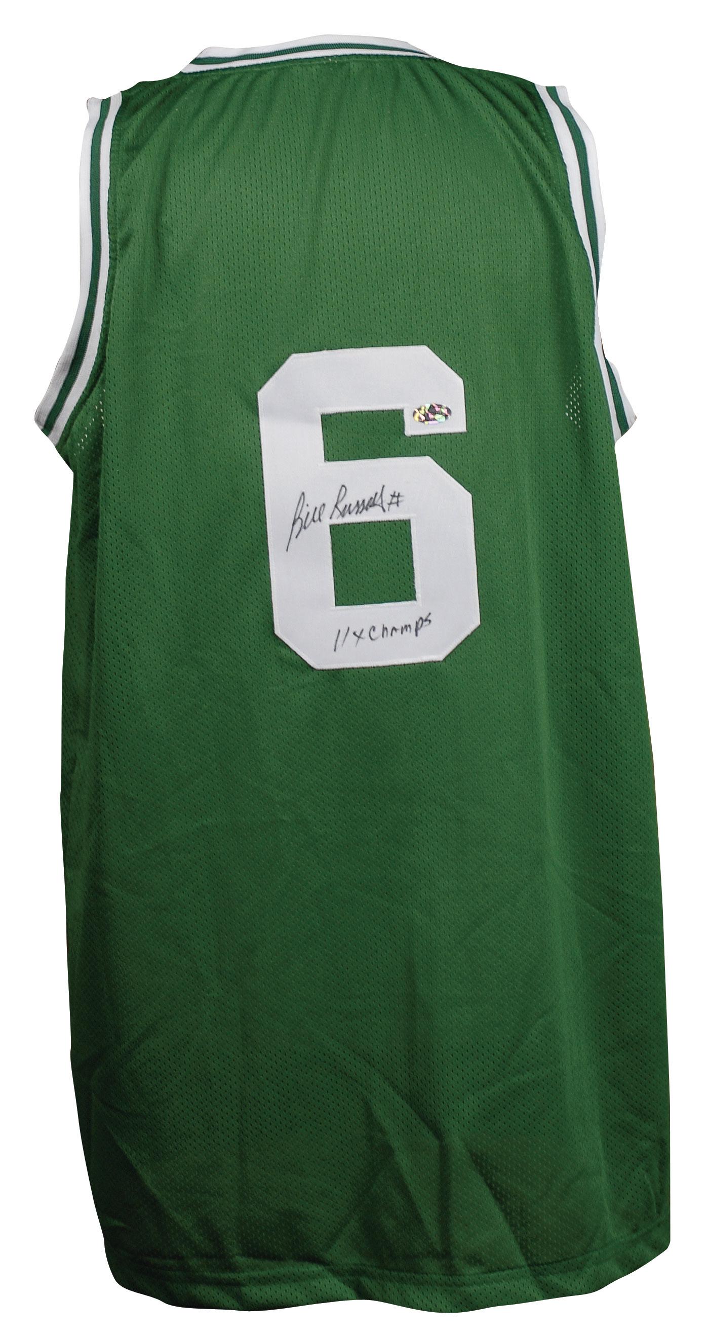 Replica Boston Celtics basketball jersey, with sewn on letters and numbers, signed in black felt tip on the number on the back, “Bill Russell #, 11x Champs” (Russell neglected to fill in his jersey number). In very fine condition.