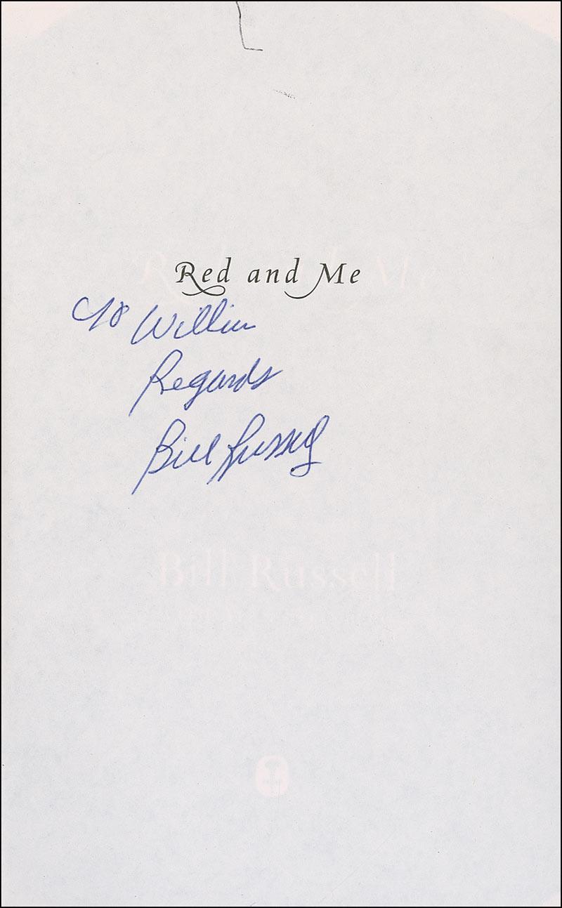Signed book: Red and Me. First edition, first printing. NY: HarperCollins, 2009. Hardcover with dustjacket, 5.75 x 8.5, 187 pages. Signed and inscribed on the half-title page, “To William, Regards, Bill Russell.” In fine condition, with a stray ink mark to top of signed page and a few light creases to dustjacket.