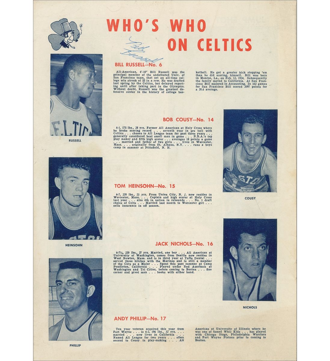 Rare original vintage Boston Garden program from the January 27, 1957, game between the Celtics and the New York Knicks, 8 x 11, signed inside in blue ballpoint above his image and biography by Russell. In very good condition, with missing covers, scattered light toning and soiling, and ink notations to inside and scorecard. Anything signed by Russell in this time period is quite uncommon.