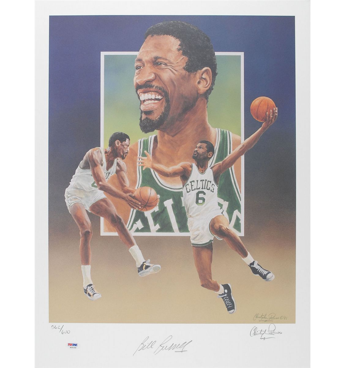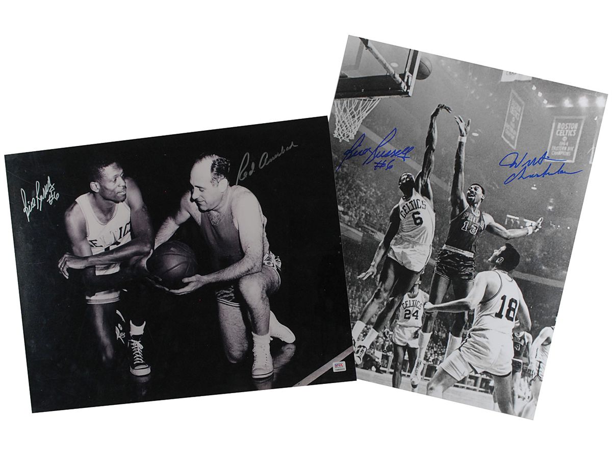 Satin-finish 16 x 20 photo of Bill Russell and Wilt Chamberlain battling in the old Boston Garden, signed in blue felt tip by both Hall of Famers; satin-finish 20 x 16 photo of Russell kneeling on the court with Red Auerbach, signed in silver ink by both; and a color limited edition 18 x 24 print, numbered 562/600, signed in the lower border in pencil. Also signed in pencil by the artist, Christopher Paluso. In overall fine condition, with PSA/DNA labels affixed to the Auerbach photo and limited print. Accompanied by the corresponding certificates of authenticity from PSA/DNA for both, as well a certificates of authenticity from Timeless Excellence, signed in blue ballpoint by Russell, “William F. Russell.”