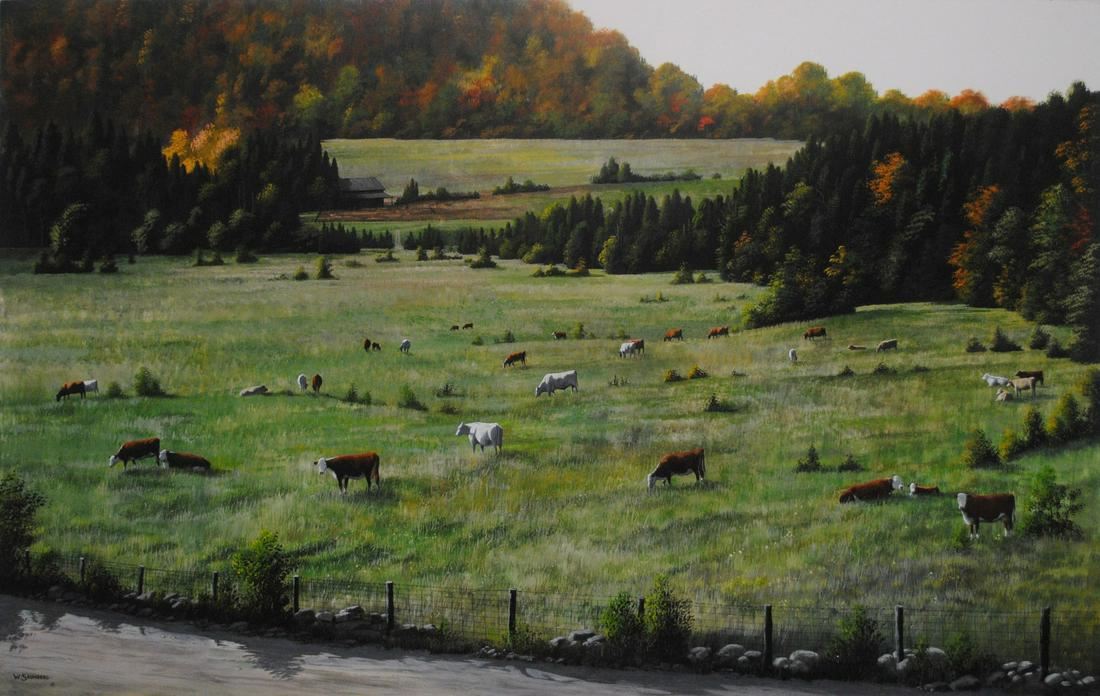 Bill Saunders' "October Grazing" original acrylic on masonite. Landscape art, wilderness, country. Image- 30" x 48".