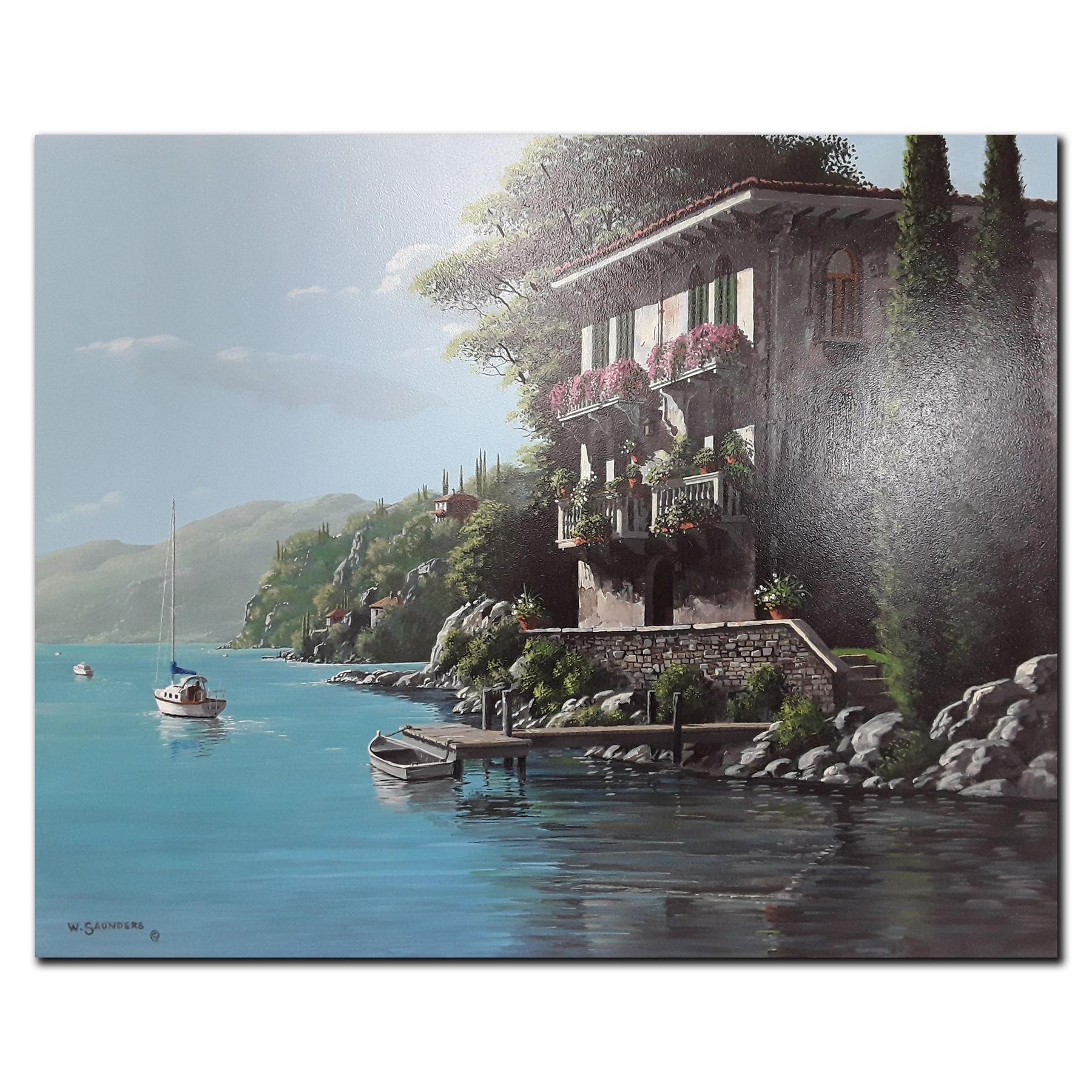 Bill Saunders' 'Seaside Villa' original acrylic painting, on masonite board. This painting is of a lovely old stone home style villa on the seaside. The villa has dock, and has a rowboat at the end of it. There is also a motorized boat on the left side of the painting, appearing to be travelling away from the villa.