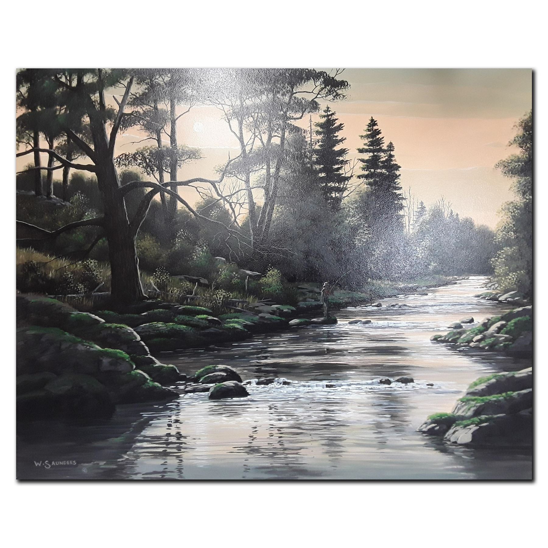 Bill Saunders' 'The Old Willow' original acrylic painting, on masonite board. This stunning painting is of a sole fisherman, standing on a rock close to the river's edge, with his rod in the water. The incredible level of detail Saunders has captured in the water, as well as the trees, is spectacular. All the green and blue colours are vivid, and the painting seems to have this sense of peace and tranquility to the viewer. 30" x 24".
