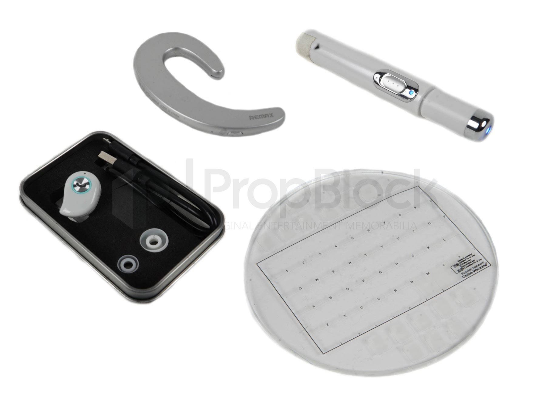 This set consists of a grey earpiece, white earpiece with box, blue light pen (untested) and custom made acrylic pad with faux numbers. This set remains in excellent, production used condition.