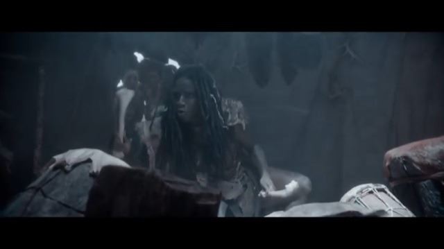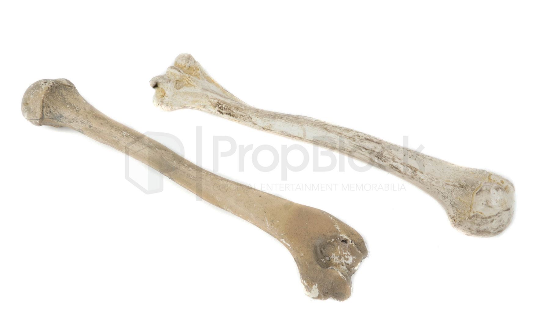 These can be seen when the daughters travel back in time and meet Grom, a "cave-woman" drummer. This set consist of two faux long bones, painted white and weathered. These were marked as hero by the production and remain in excellent, production used condition.