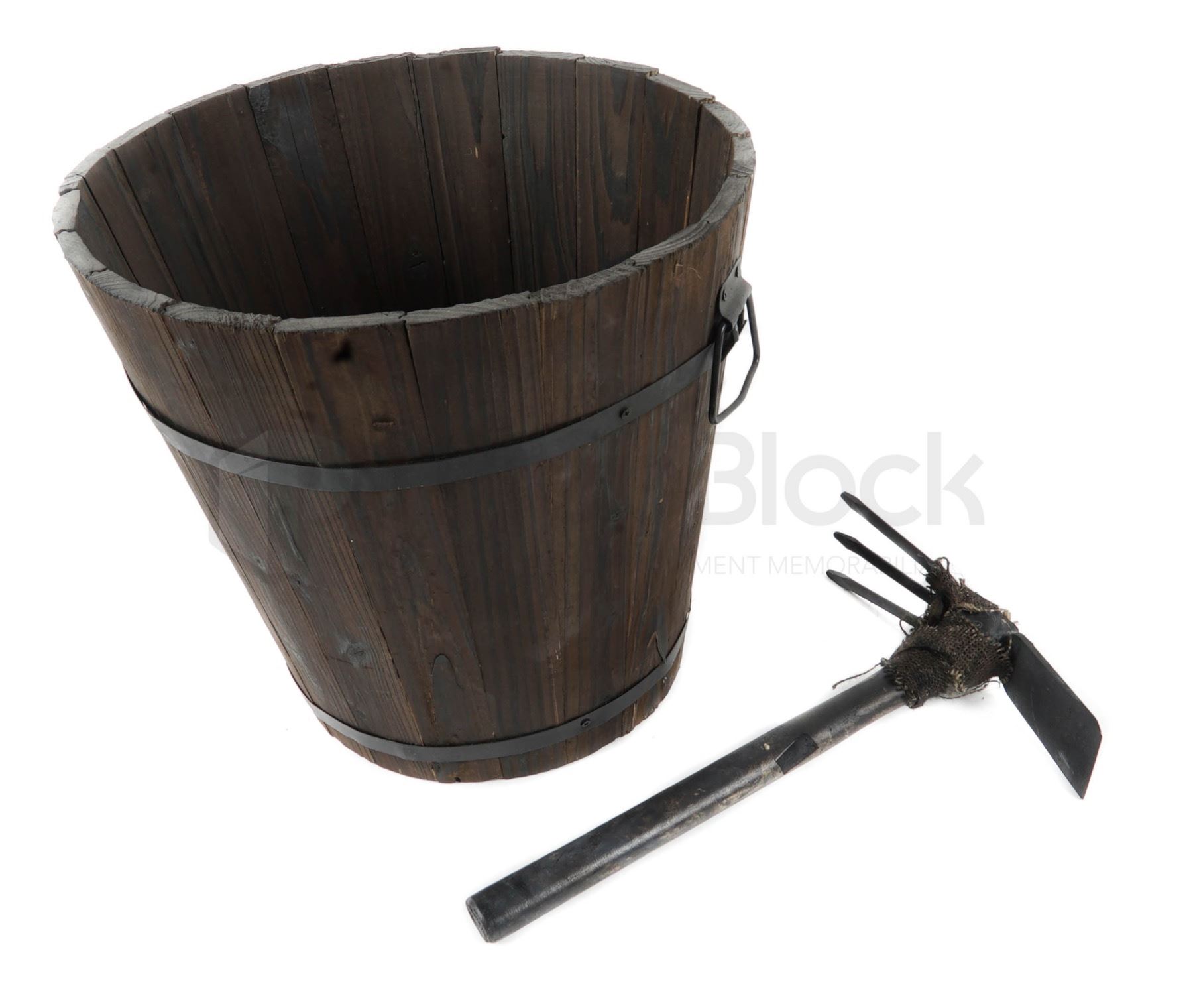 Set of tool used in the "Hell" scene in the 2020 sci fi comedy film Bill & Ted Face the Music. used in the opening scene of the 2020 sci fi comedy Bill & Ted Face the Music. Once told they'd save the universe during a time-traveling adventure, 2 would-be rockers from San Dimas, California find themselves as middle-aged dads still trying to crank out a hit song and fulfill their destiny. This set includes a wooden bucket and hand pick axe from the hell landscape mining sequence. All items feature heavy weathering to simulate coal being mined in hell. This set remains in excellent, production used condition.