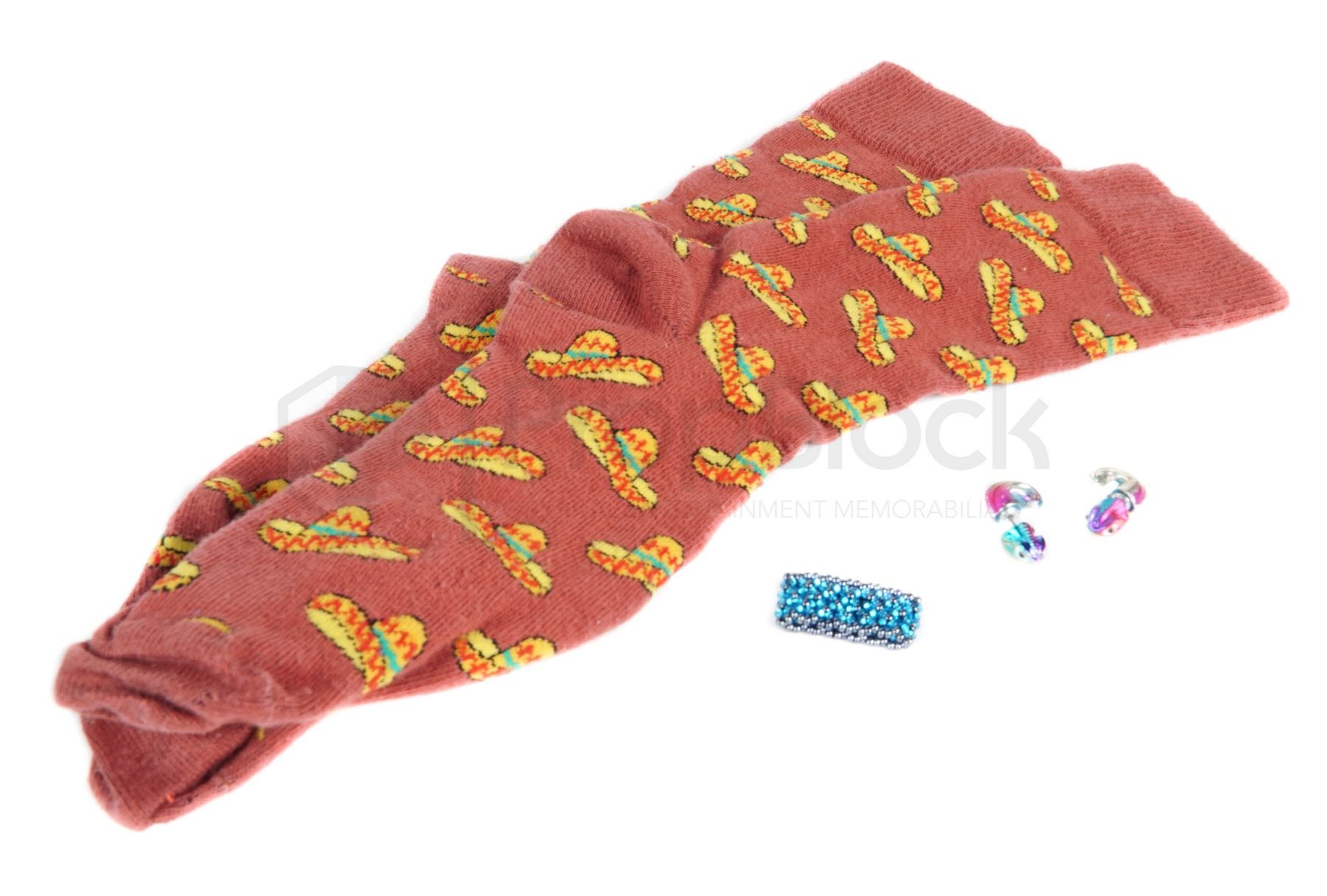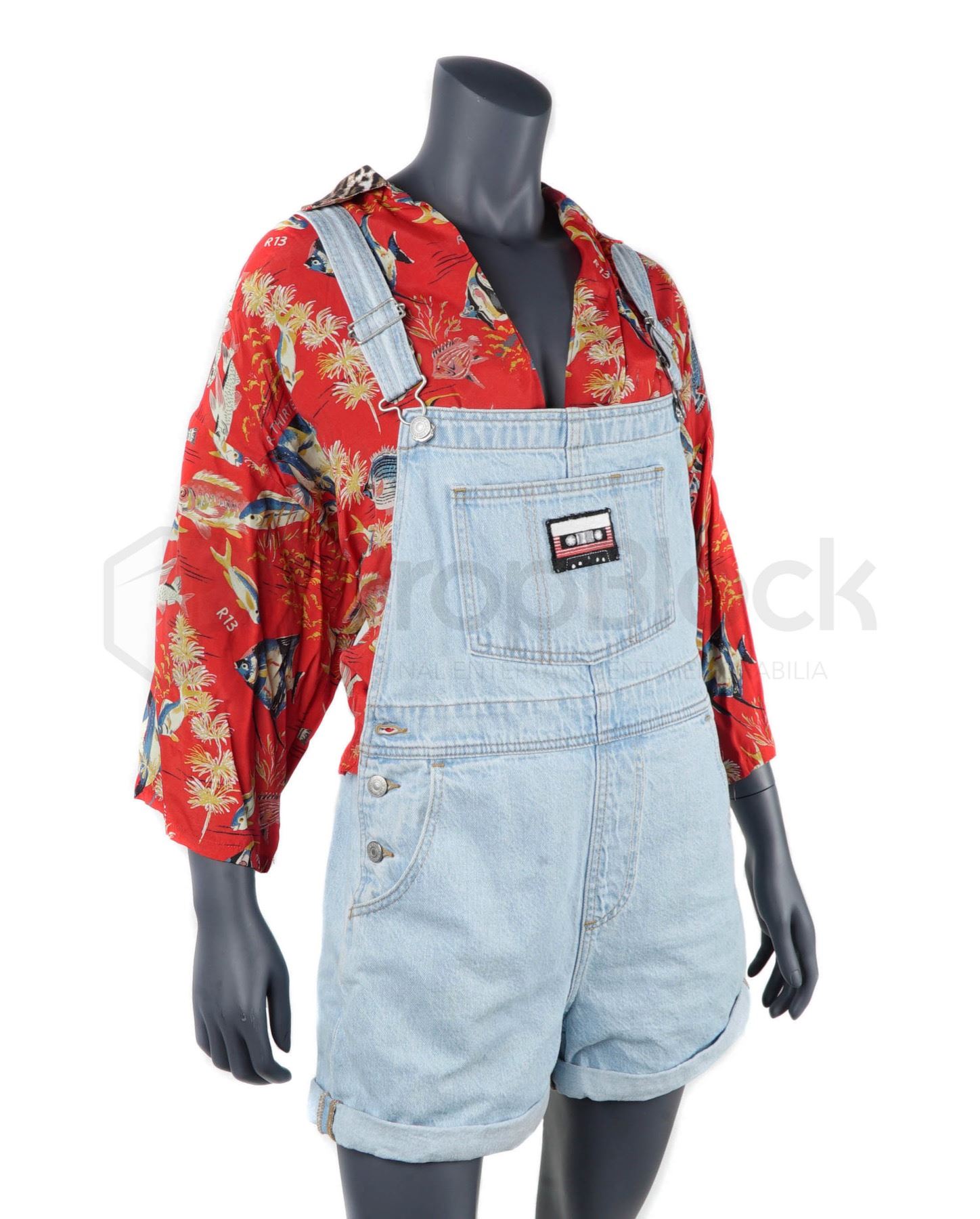 This piece consists of a large red short sleeved shirt that is missing the buttons on the front and has extra long sleeves unlike the screenused version (this version may be unfinished or stunt performer) and the other pieces including a pair of light wash overalls with cassette tape patch on the front, a pair of socks and an elastic multicolored ring and pair of earrings were worn by Weaving. This costume remains in excellent, production used condition.