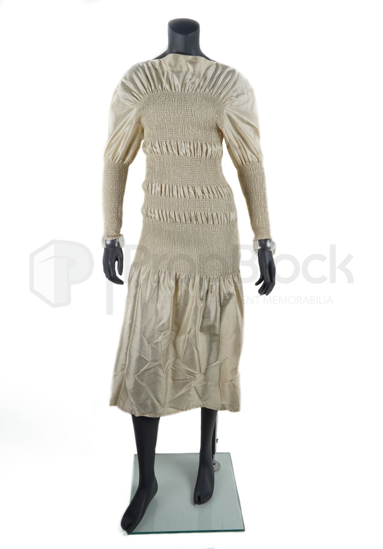 The "Nobles" can be seen in the future, as heads of a council lead by The Great Leader. This costume consists of a one piece dress with long sleeves, beige and cream in color, this piece features a ruffled neck area, zip up back and set of clear acrylic bracelets. This piece remains in excellent, production used condition.