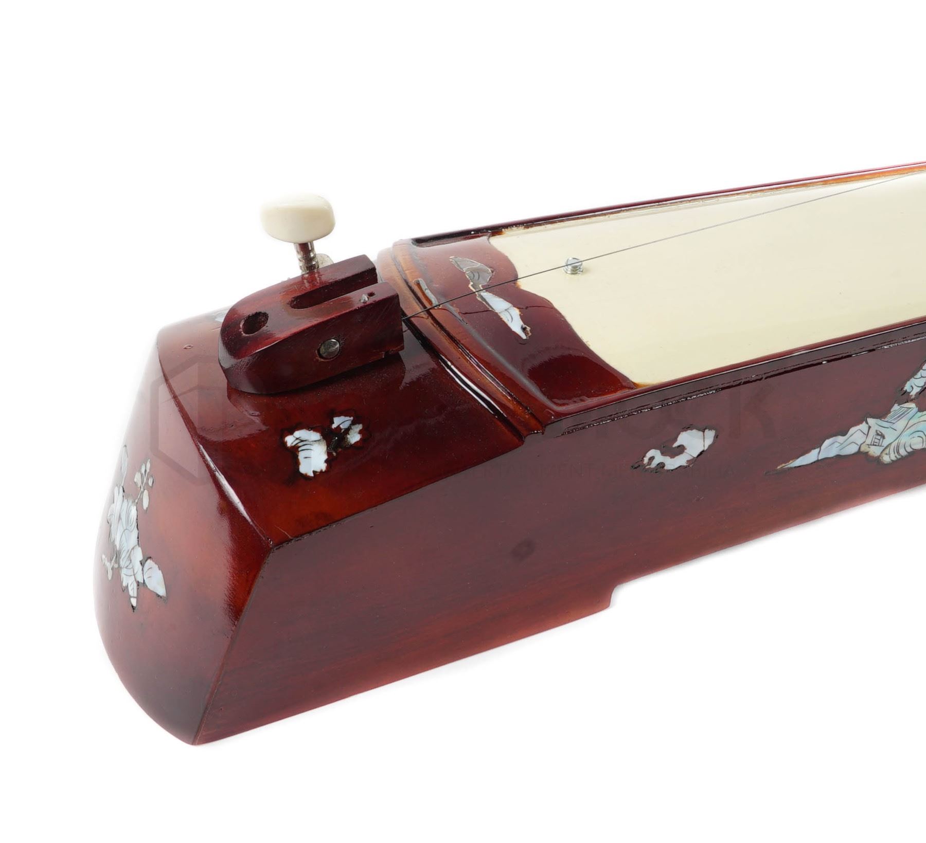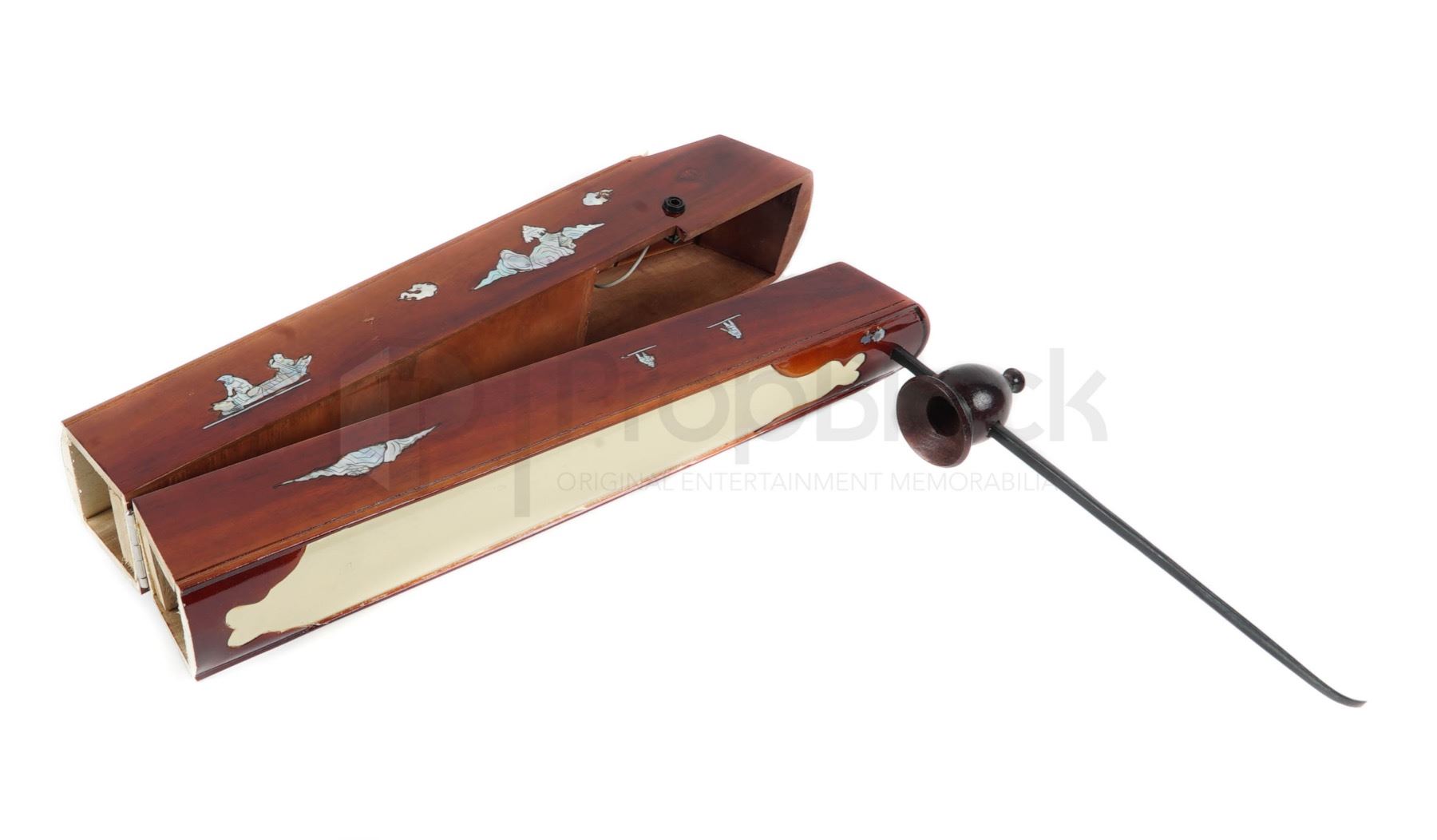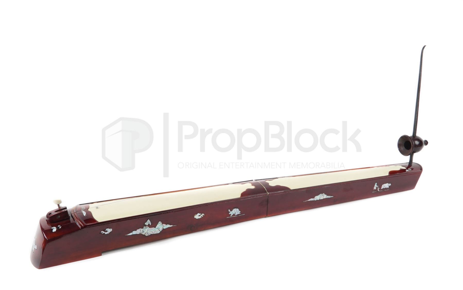 String instrument used in the opening scene of the 2020 sci fi comedy Bill & Ted Face the Music. Once told they'd save the universe during a time-traveling adventure, 2 would-be rockers from San Dimas, California find themselves as middle-aged dads still trying to crank out a hit song and fulfill their destiny. During the wedding scene, Bill & Ted use a variety of instruments to create one of their new songs. This string style instrument can be seen in the background behind Ted along with various other musical instruments. This piece is made of wood and features a long varnished brown wooden body that folds in half. One end there is a long black removable section, with an attached wire that strings to the other side of the instrument. This piece no longer functions as a working instrument. This piece remains in excellent, production used condition.