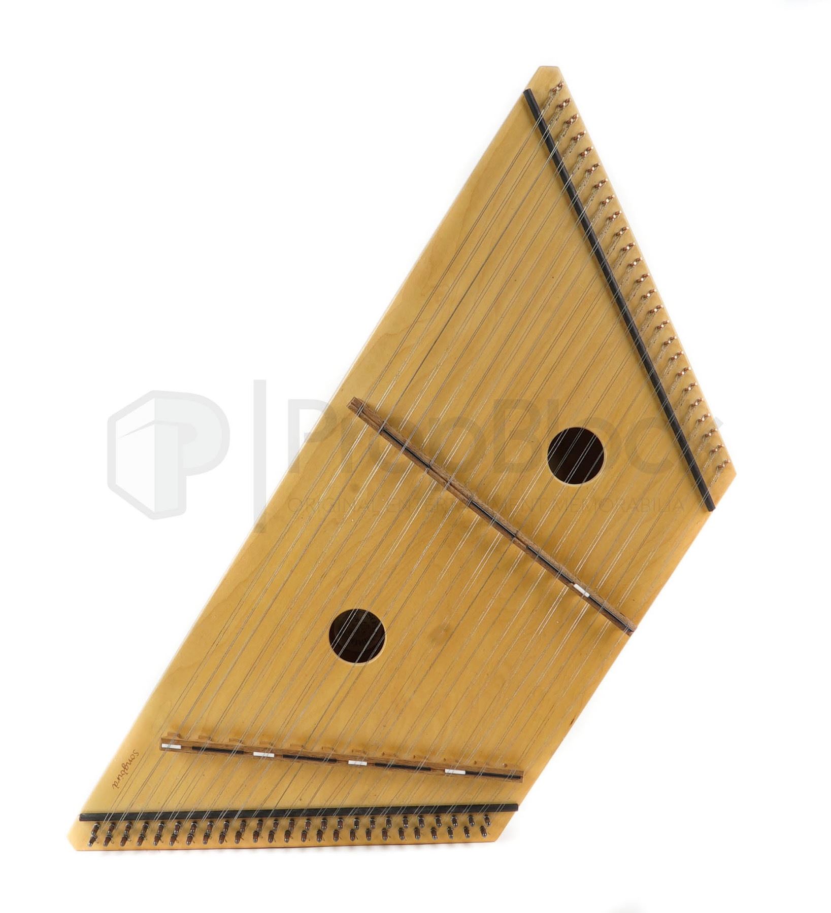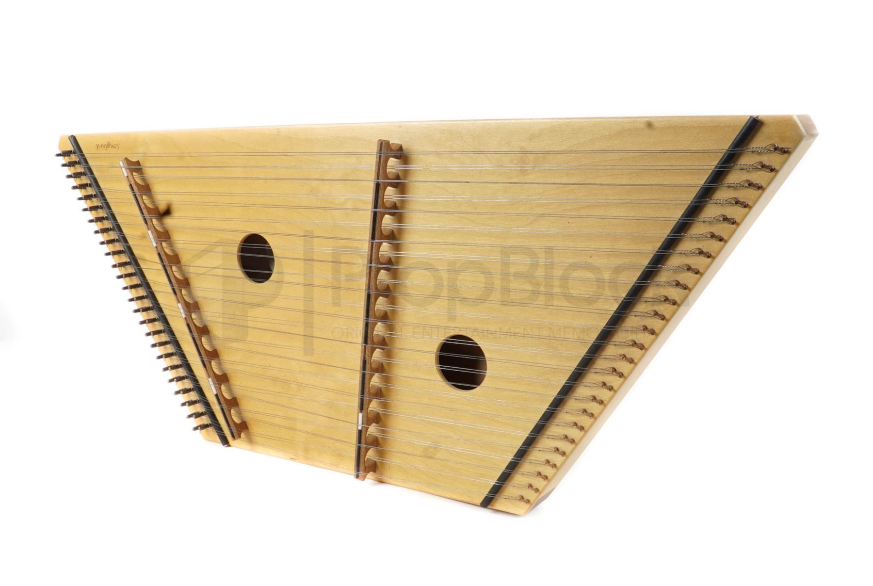 String instrument used in the opening scene of the 2020 sci fi comedy Bill & Ted Face the Music. Once told they'd save the universe during a time-traveling adventure, 2 would-be rockers from San Dimas, California find themselves as middle-aged dads still trying to crank out a hit song and fulfill their destiny. During the wedding scene, Bill & Ted use a variety of instruments to create one of their new songs, like this one that can be seen in the background. This piece is made of wood, hollow and in the shape of a trapeze. The front features two holes a numerous wires strung from one side to the other. This piece remaisn in excellent, production used condition.
