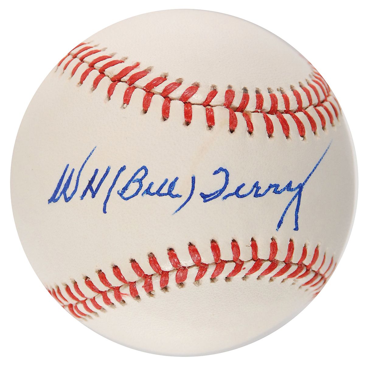 Official Rawlings National League (Giamatti) baseball signed in blue ballpoint on the sweet spot, “W. H. (Bill) Terry.” In fine condition.