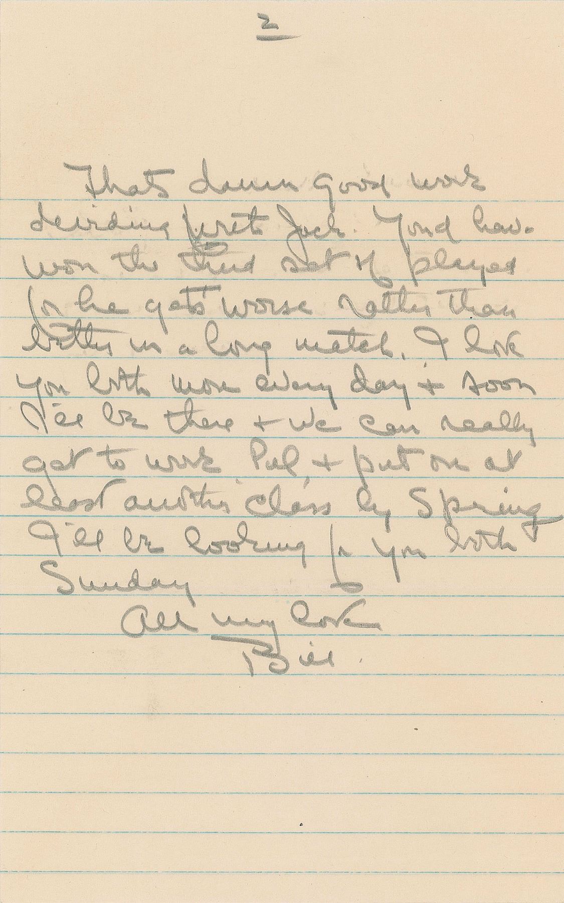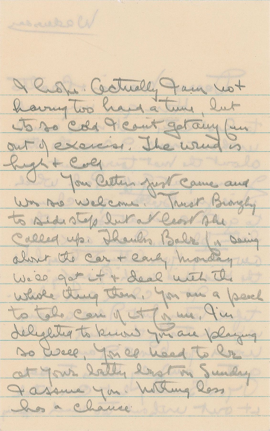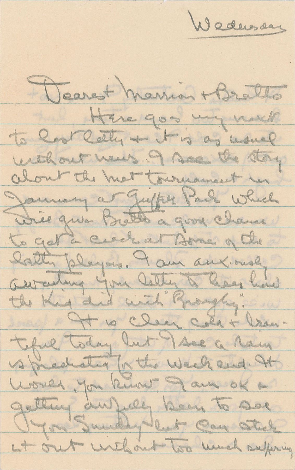 ALS in pencil, signed “Bill,” three pages on two sheets, 5 x 8, postmarked December 15, 1949. Letter from prison to Marion Anderson and his protege Arthur Bratto, in part: "Here goes my next to last letter & it is as usual without news. I see the…tournament in January at Griffith Park which will give Bratto a good chance to get a crack at some of the better players…I am ok & getting awfully keen to see you Sunday but can stick it out without too much suffering I hope. Actually I am not having too hard a time, but it's so cold I can't get any fun out of exercise. The wind is high & cold…I'm delighted to know you are playing so well, you'll need to be at your…best on Sunday I assure you." In fine condition. Accompanied by the original mailing envelope, addressed in his own hand and signed again in the return field, "W. T. Tilden."