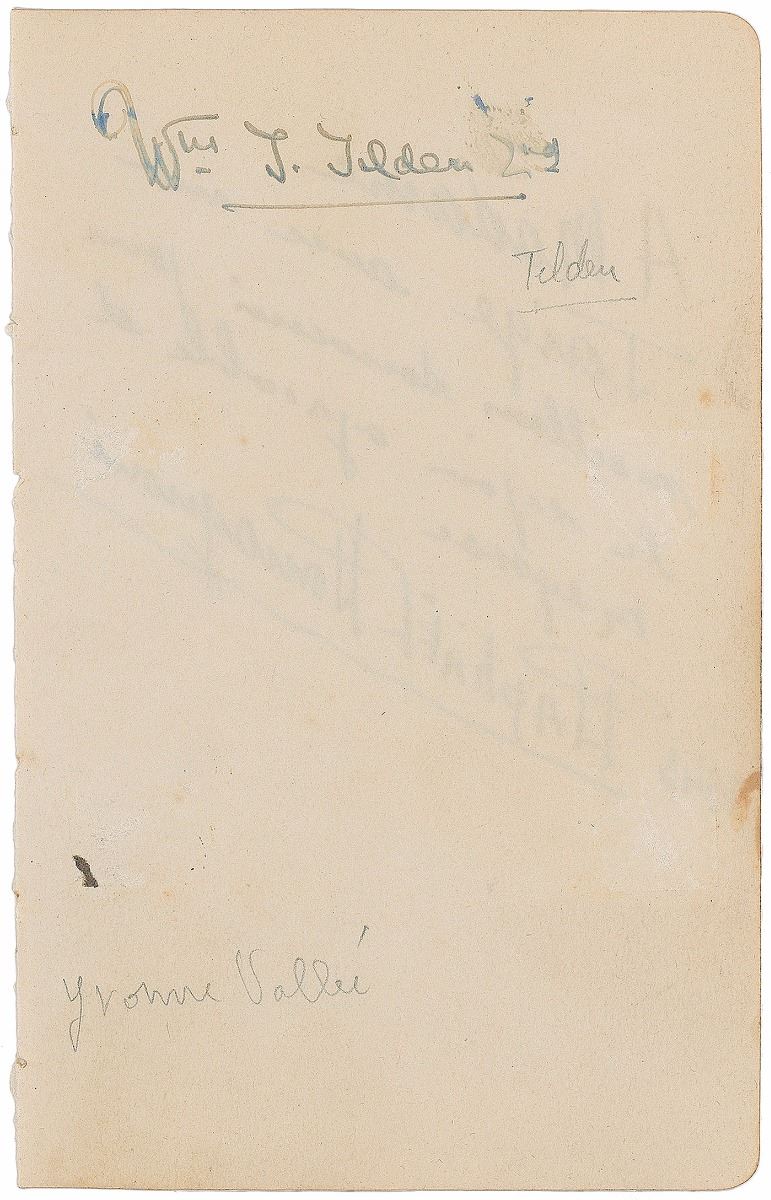 Vintage fountain pen signatures, “Wm. T. Tilden 2nd” and “J. Borotra, le 5 September 1932, a Mlle Germaine,” on two individual off-white 3.5 x 5.75 album pages. In overall very good condition.