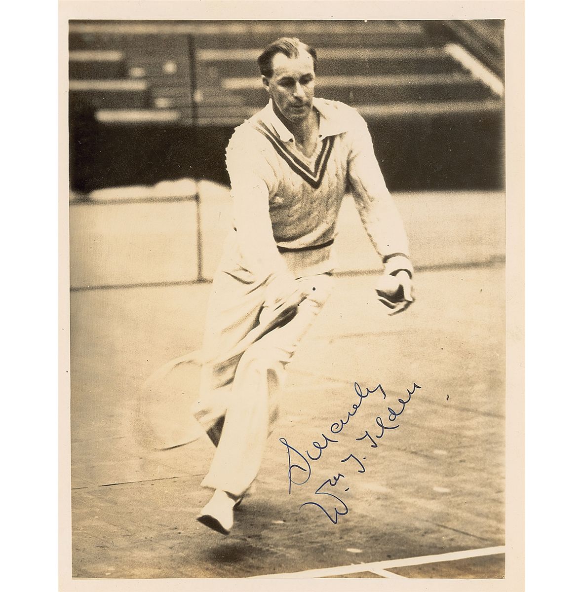 Famed American tennis player (1893–1953) whose major tournament victories number in the dozens, including six consecutive years as US Singles Champion. Choice vintage glossy 8 x 10 photo of Tilden on the court mid-swing, boldly signed against the light background in fountain pen, “Sincerely, Wm. J. Tilden.” In fine condition, with some creasing to the left border, not affecting the great image or ideal signature.
