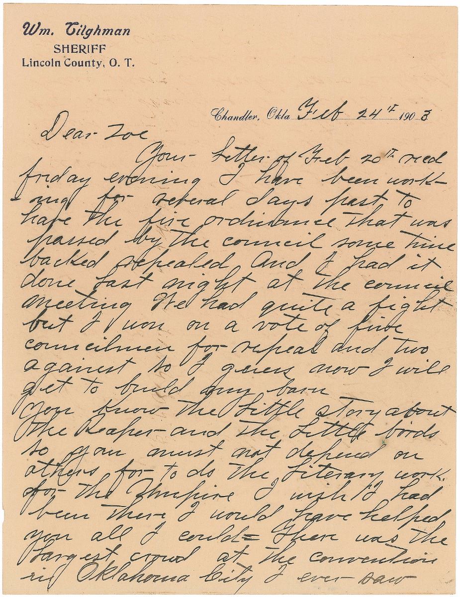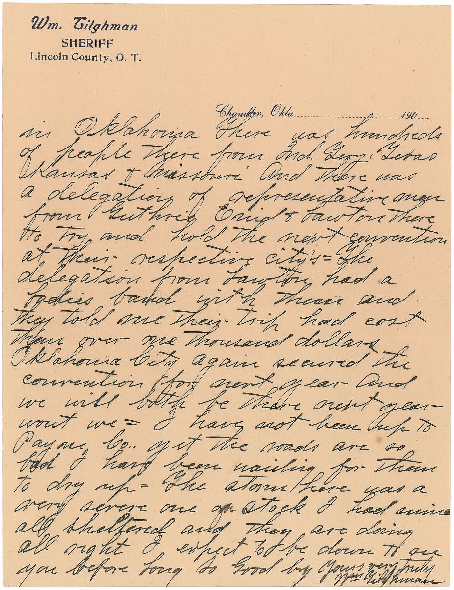 Famed lawman and gunfighter (1854–1924) who began his career as a deputy under Bat Masterson. ALS signed “Wm. Tilghman,” two pages, 8.5 x 10.75, Lincoln County sheriff letterhead, February 24, 1903. Letter to his wife, in part (spelling and grammar retained): “I have been working for several days past to have the fire ordinance that was passed by the council some time backed repealed and I had it done last night at the council meeting. We had quite a fight but I won on a vote of five councilmen for repeal and two against so I guess now I will get to build my barn…There was the largest crowd at the convention in Oklahoma City I ever saw in Oklhoma. There was hundreds of people there from Ind. Tery, Texas, Kansas & Missouri and there was a delegation of representative men from Guthrie, Enid & Lawton there to try and hold the next convention at their respecting city’s.” In fine condition. Accompanied by a beautiful custom-made leatherbound presentation folder. Provenance: Warren Anderson, 1995.